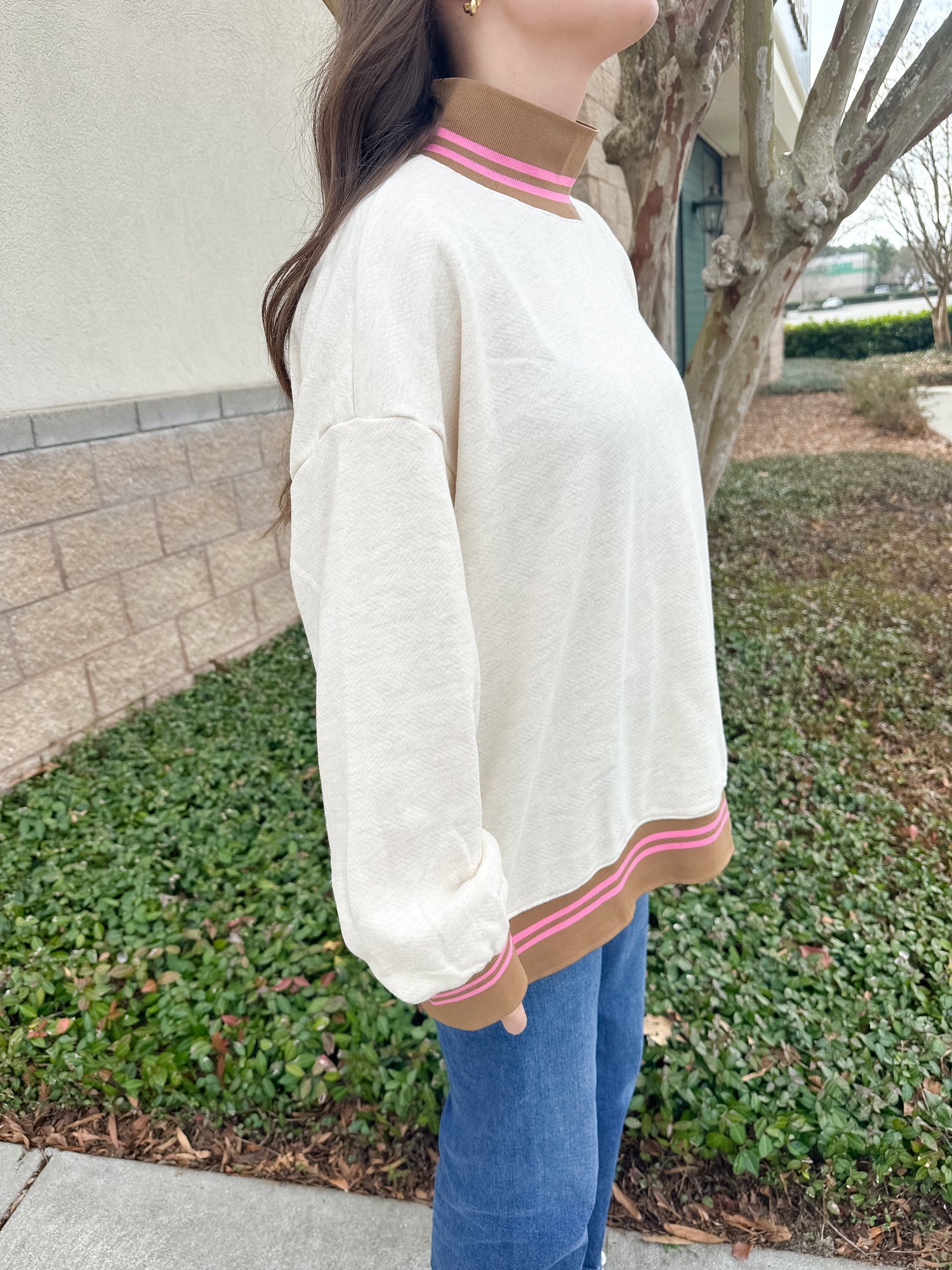 The Agnes Mockneck Sweater from Bucketlist is a mockneck sweatshirt with a striped band detailing. Sizes S-L available.