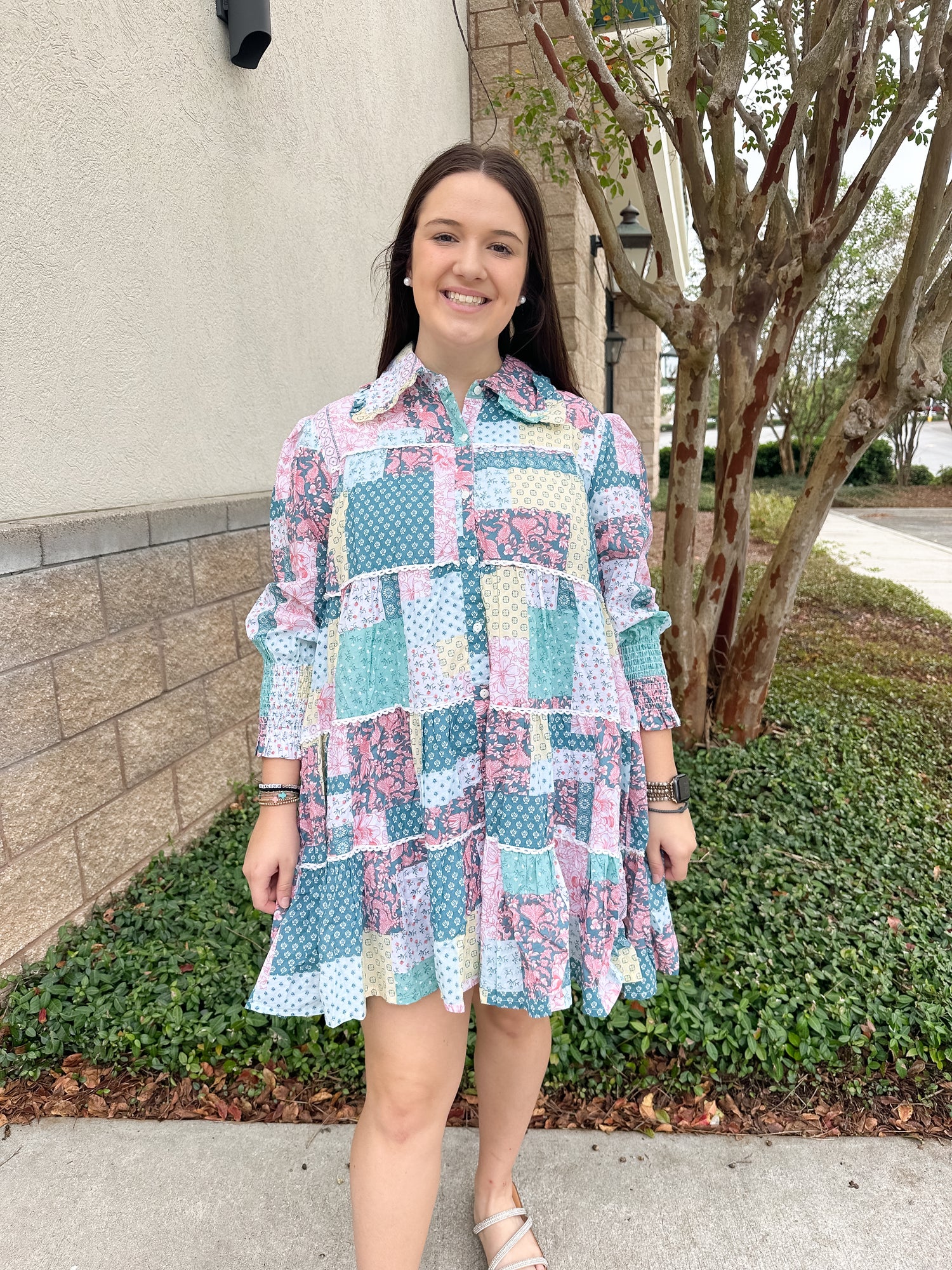 The Allie dress feature baby doll fit with tiered skirt, collared neckline, buttonfront closure, shirred cuffed, midi length and Simply Southern logo label. Made of 100% cotton.