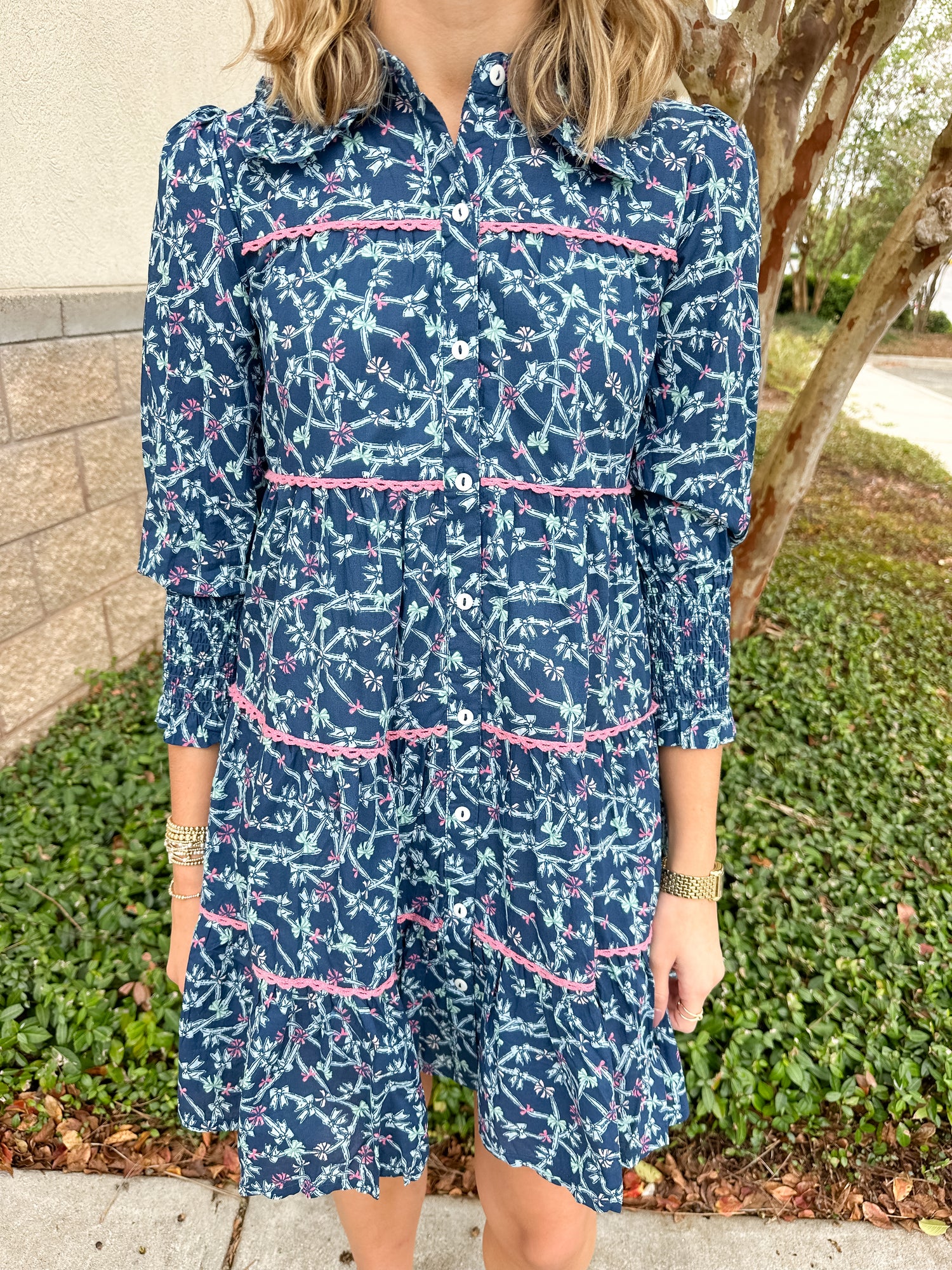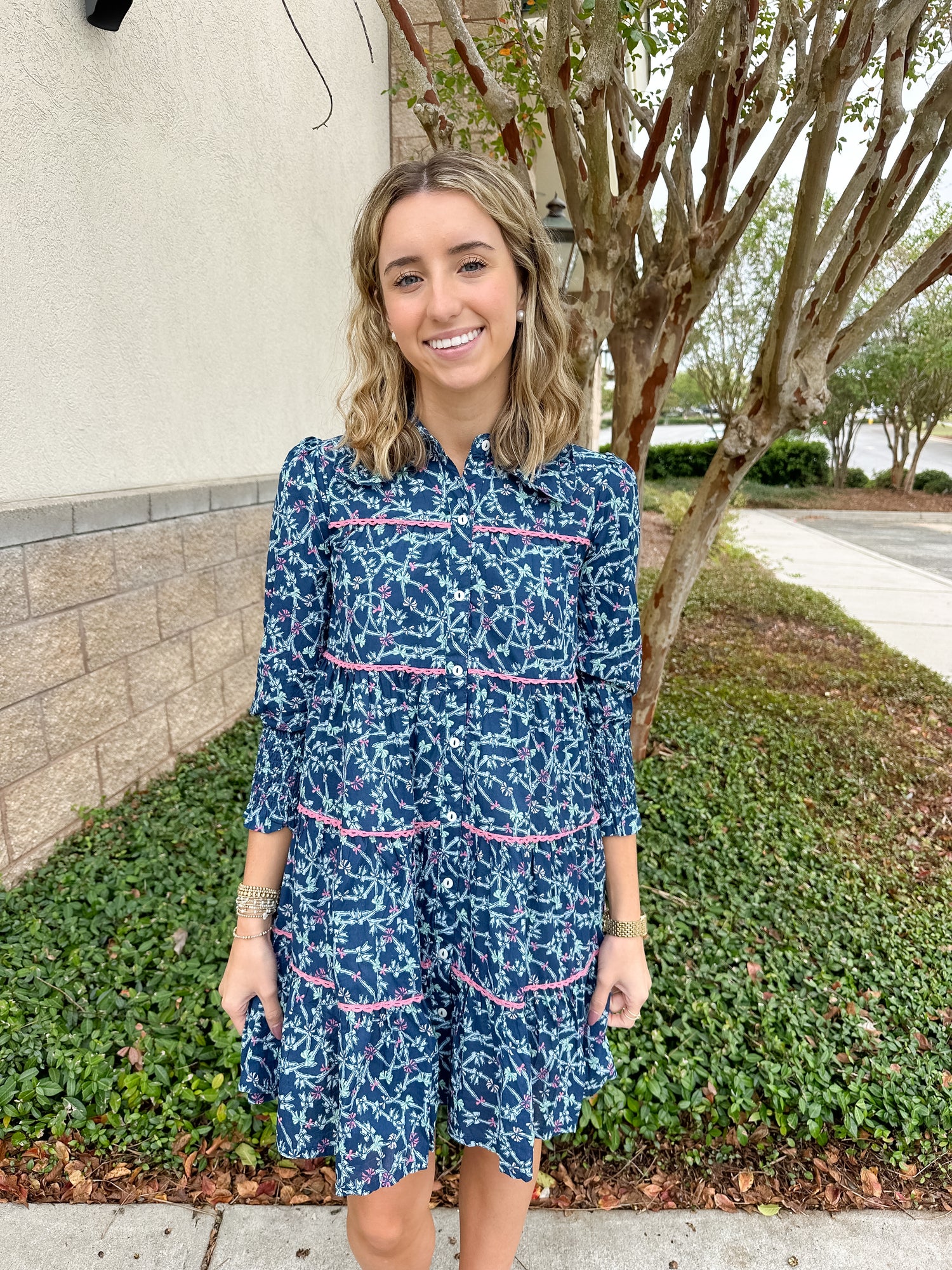 The Allie dress feature baby doll fit with tiered skirt, collared neckline, buttonfront closure, shirred cuffed, midi length and Simply Southern logo label. Made of 100% cotton.