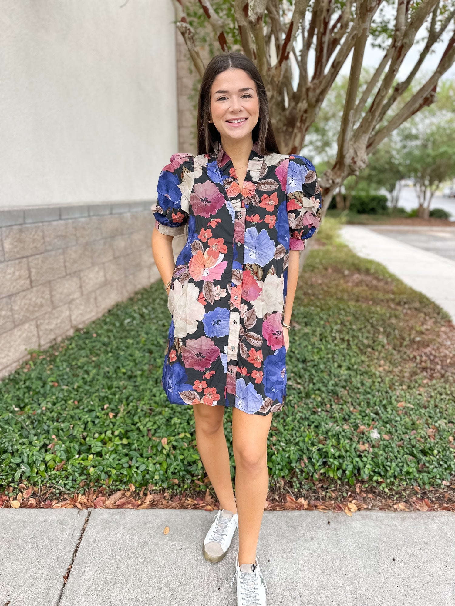 The Angie Dress is perfect for fall with dark colors and floral patterns from Entro.