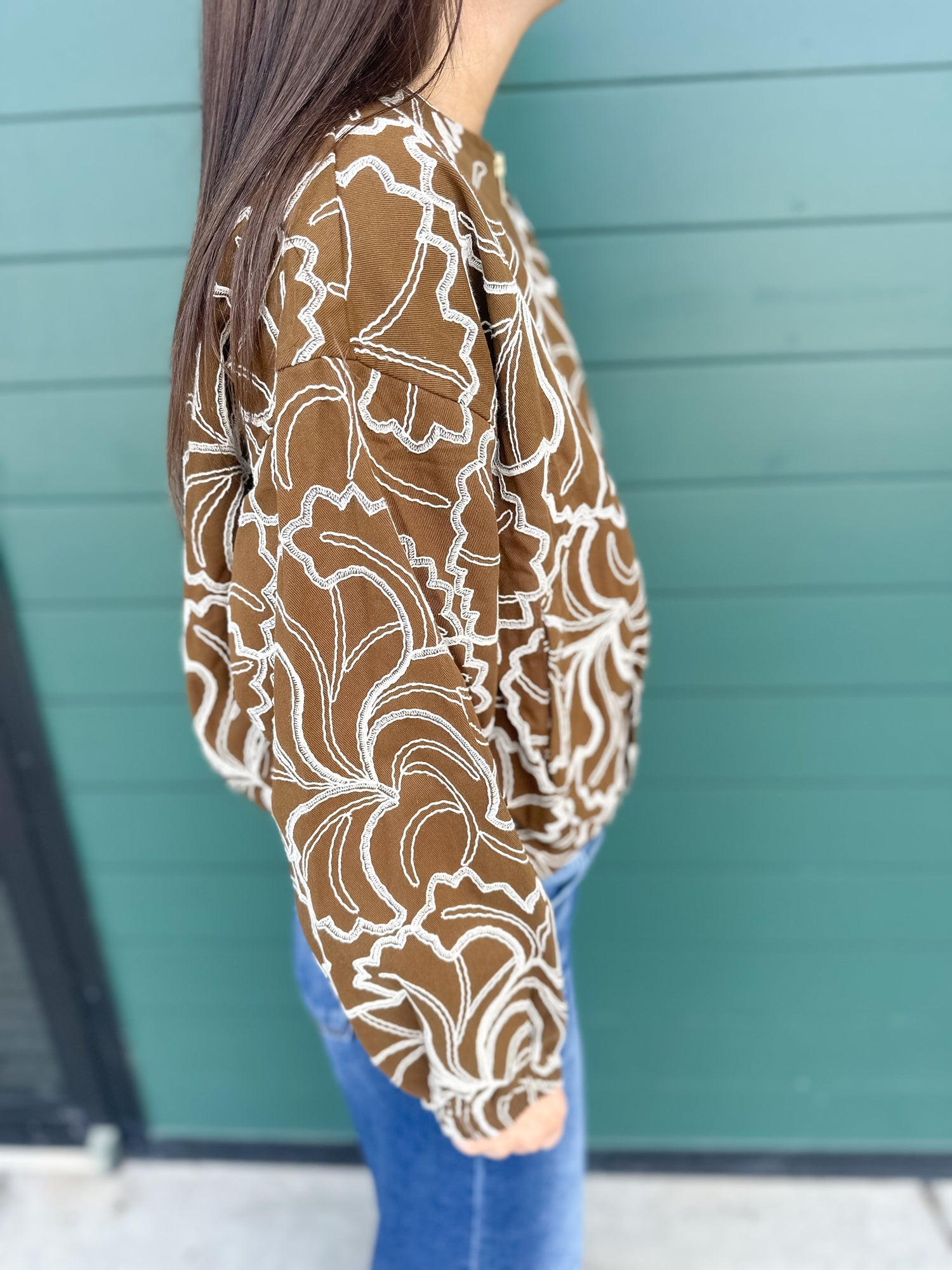 The Annalise Embroidered Jacket from Entro is so perfect for the fall. It is offered in tan and brown, sizes Small-Large.
