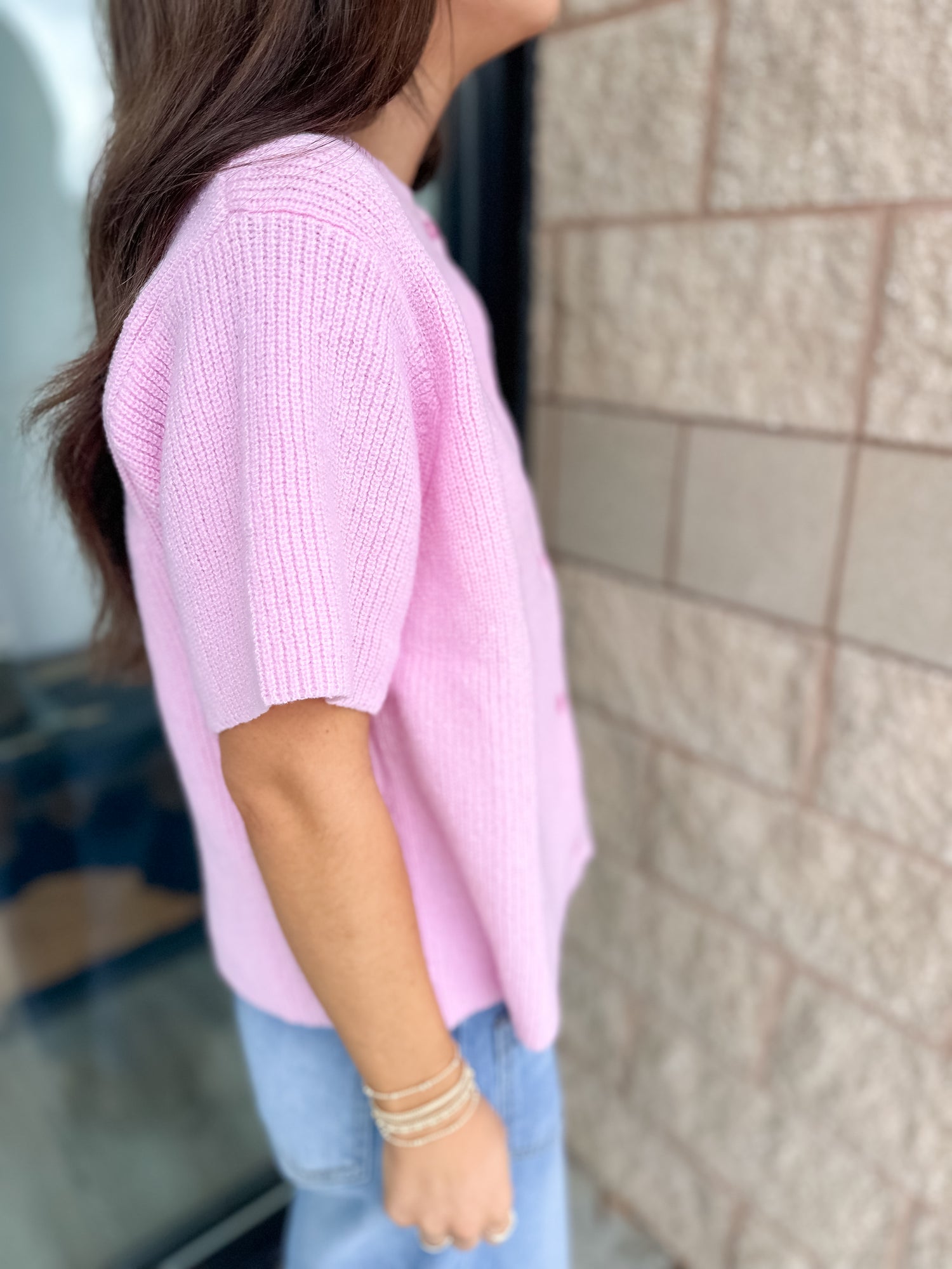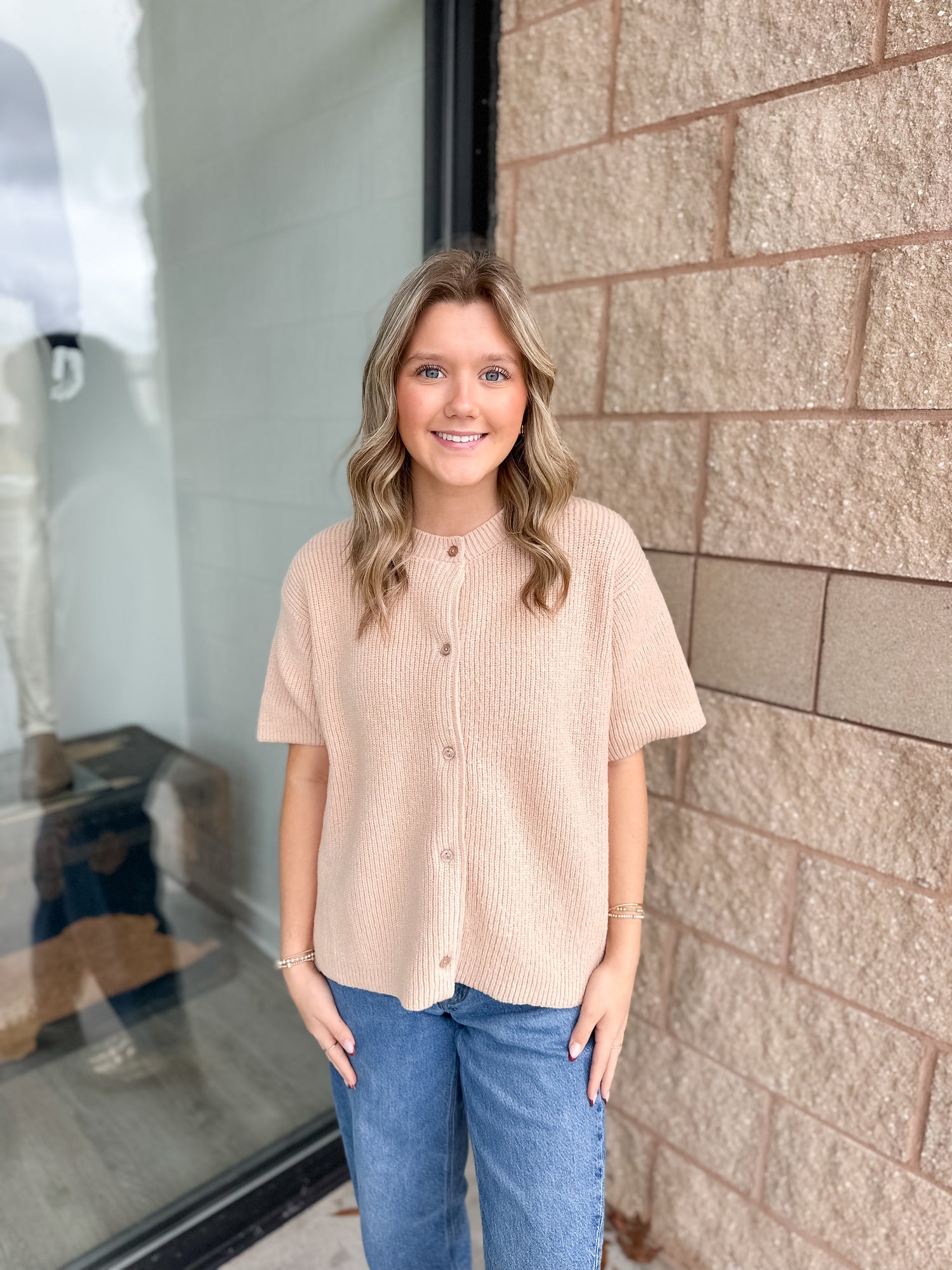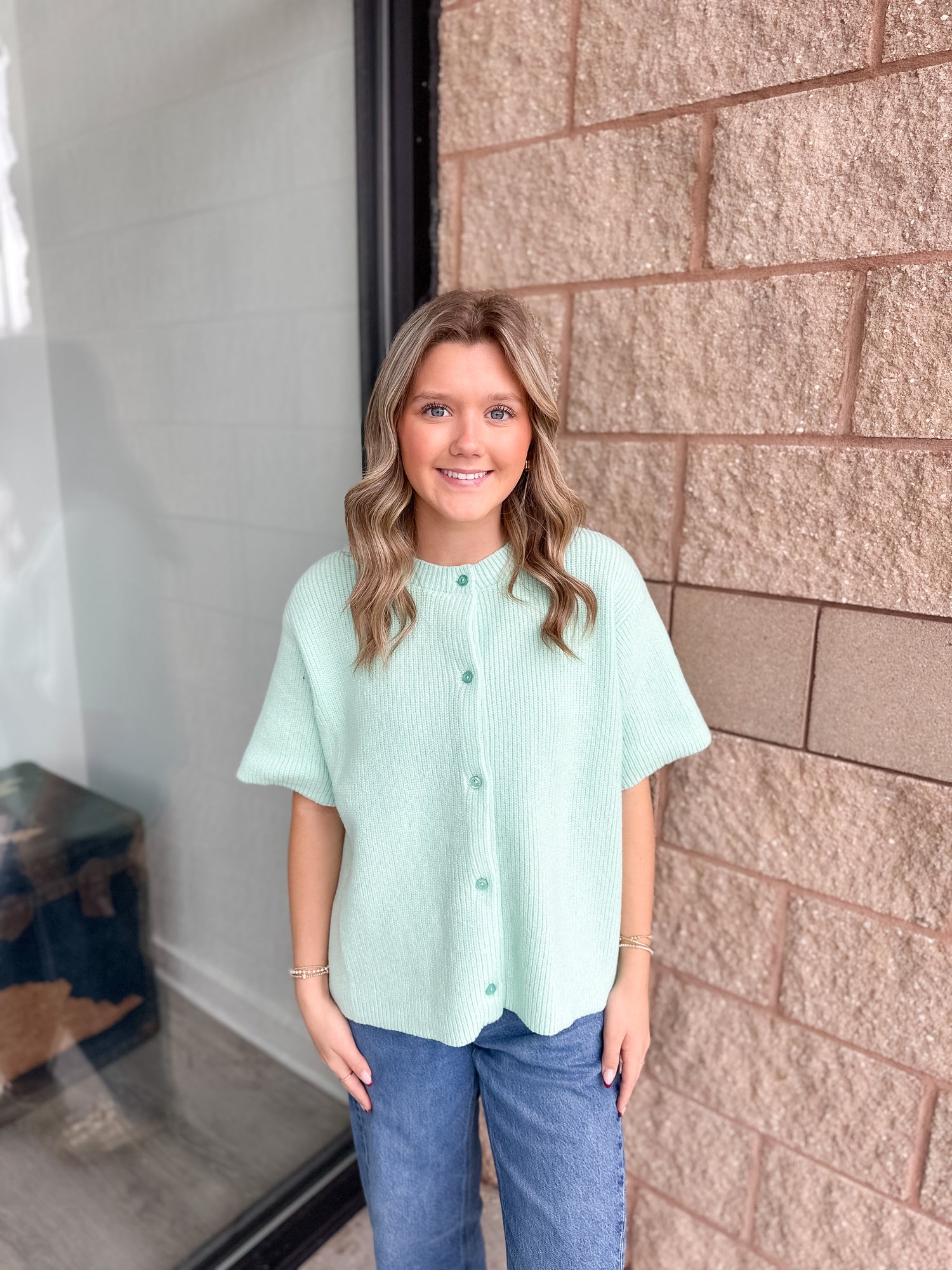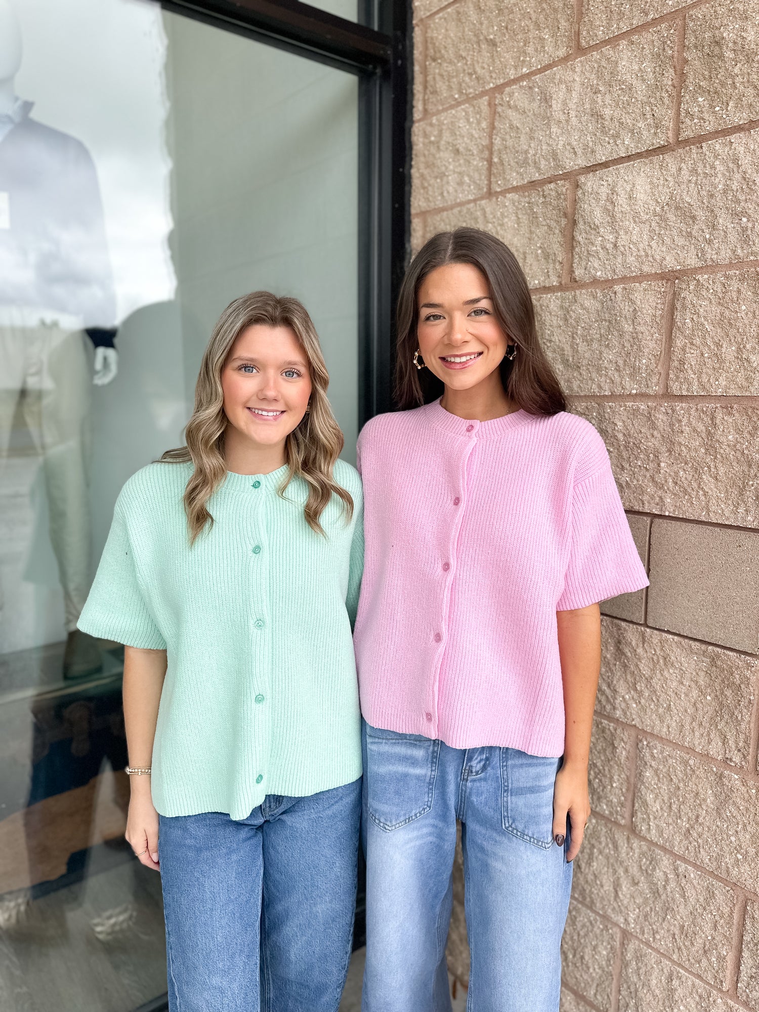 The Brenda Cardigan from Lelis is a round neck short sleeve sweater cardigan. This sweater comes in beige, mint, and pink. Sizes XS-L available.