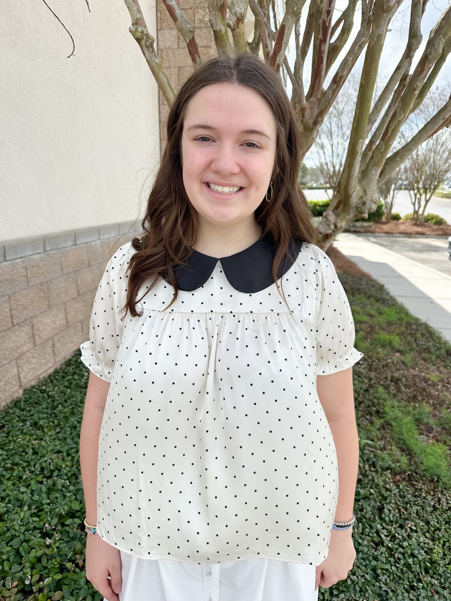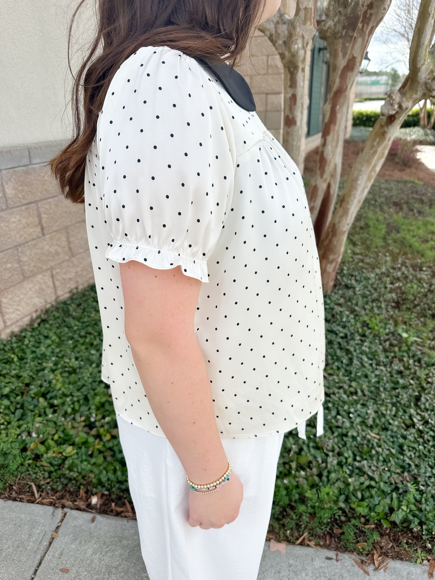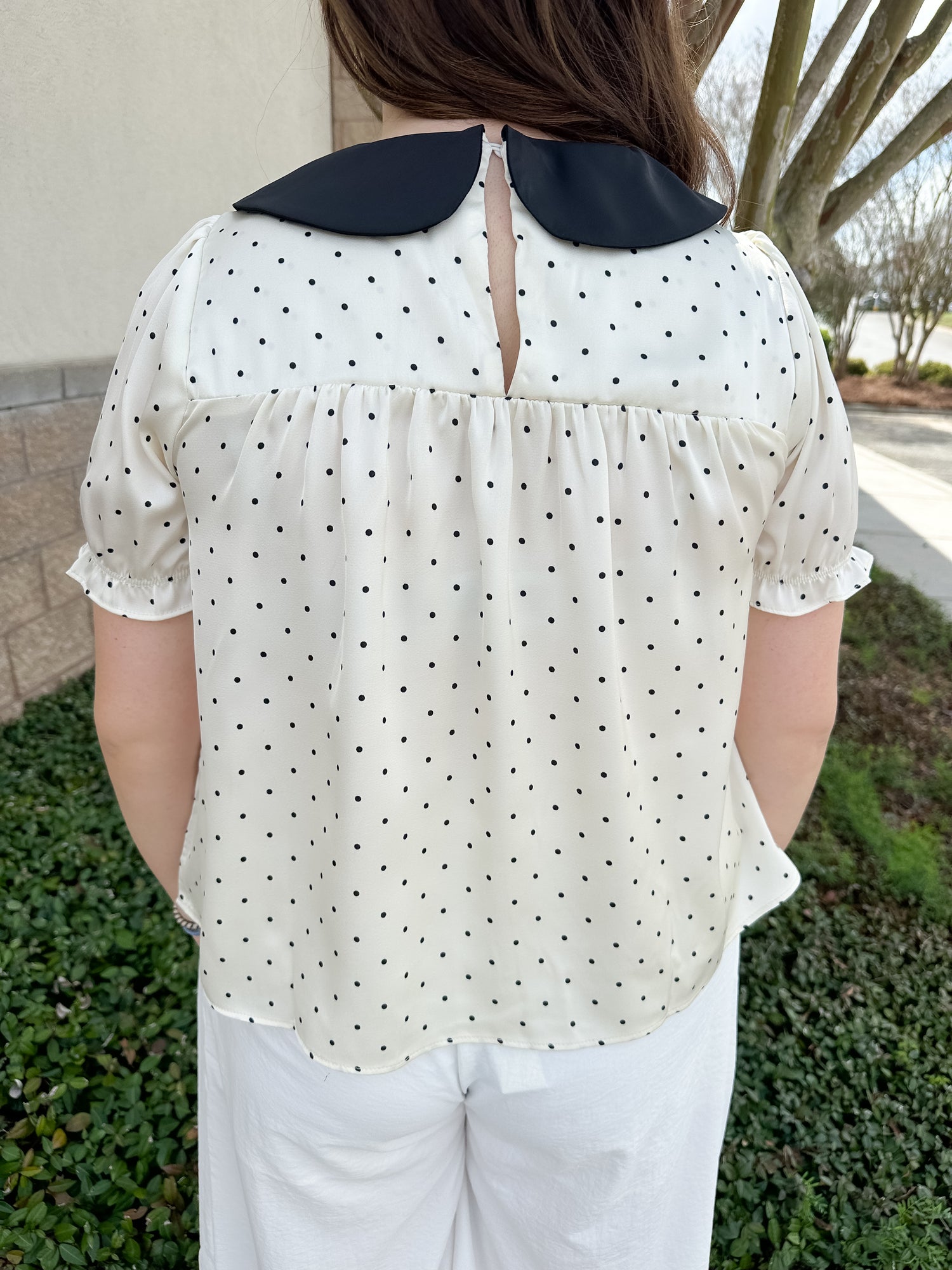The Business Betty Top from Wishlist Apparel is a polka dot collar blouse.