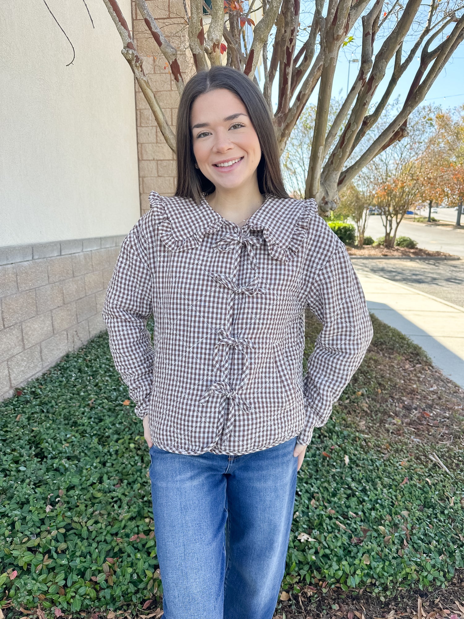 This Callie Gingham Jacket from Karlie features the prettiest brown gingham print with a ruffled collar and pockets! Size S-L available.