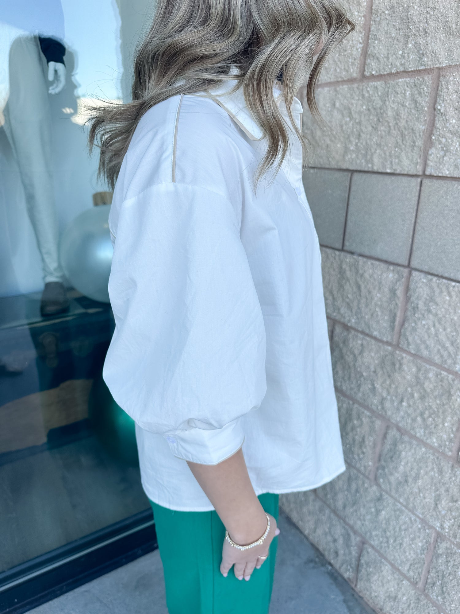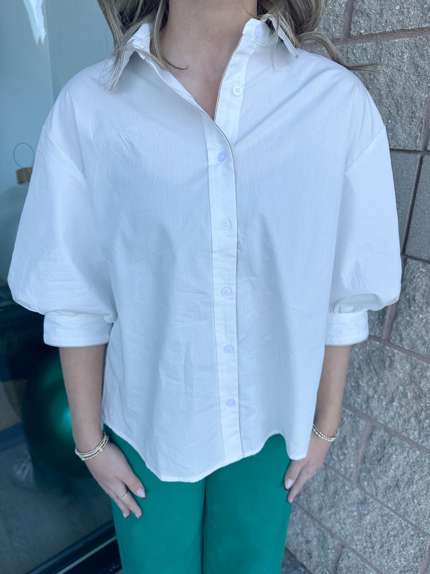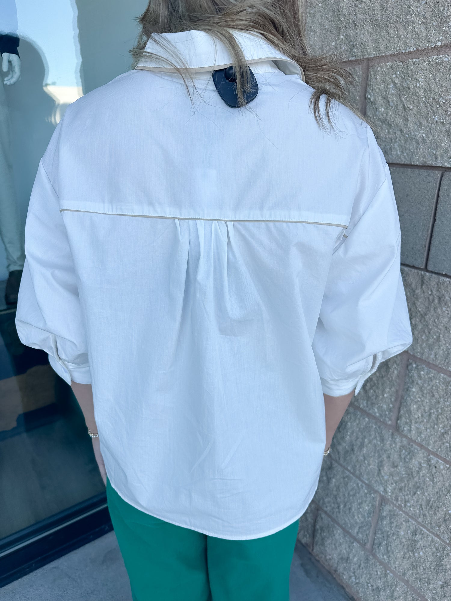 The Carol Top from Day & Moon is a white button down shirt with bubble sleeves and contrast piping. Sizes S-L available.