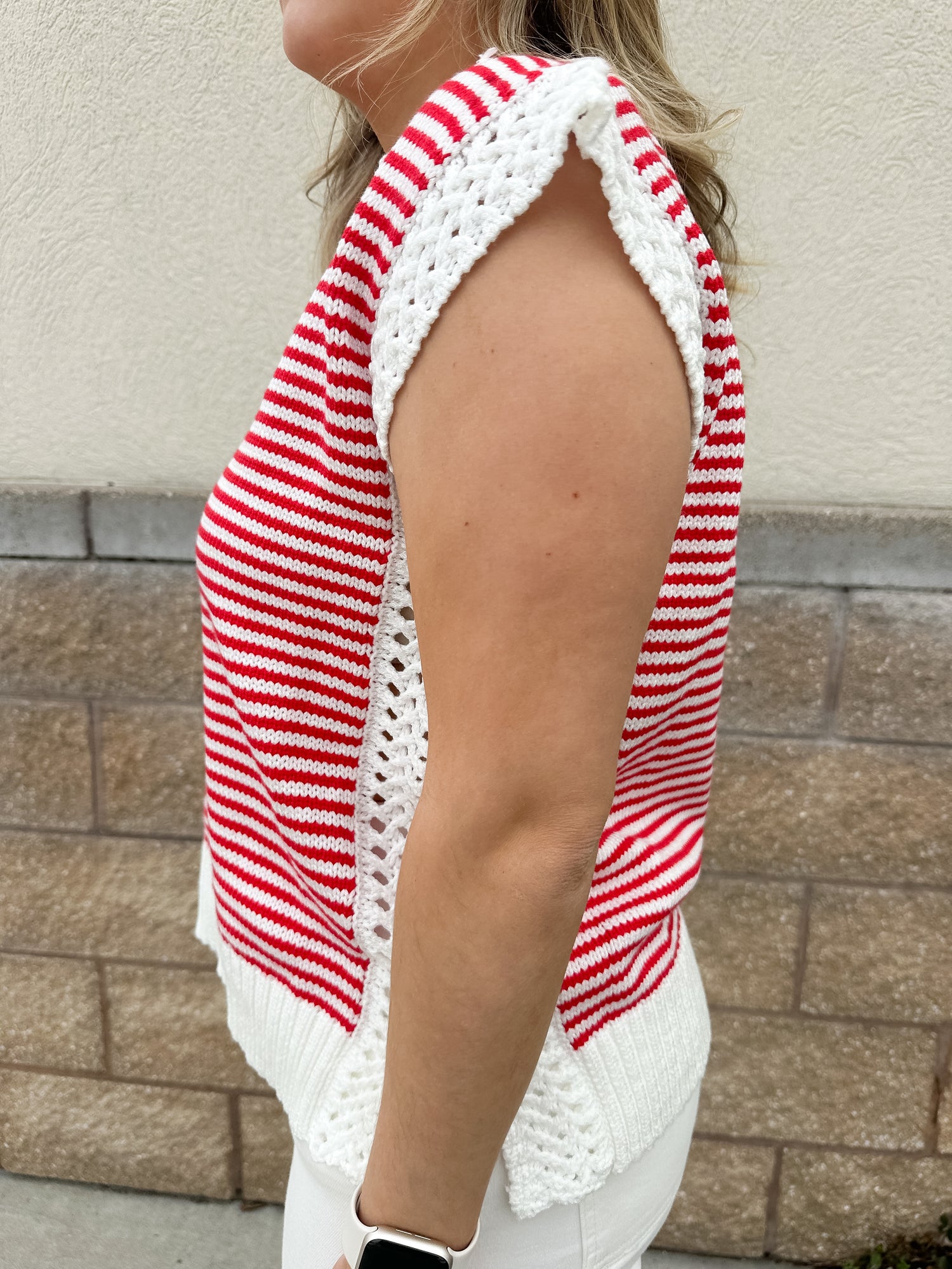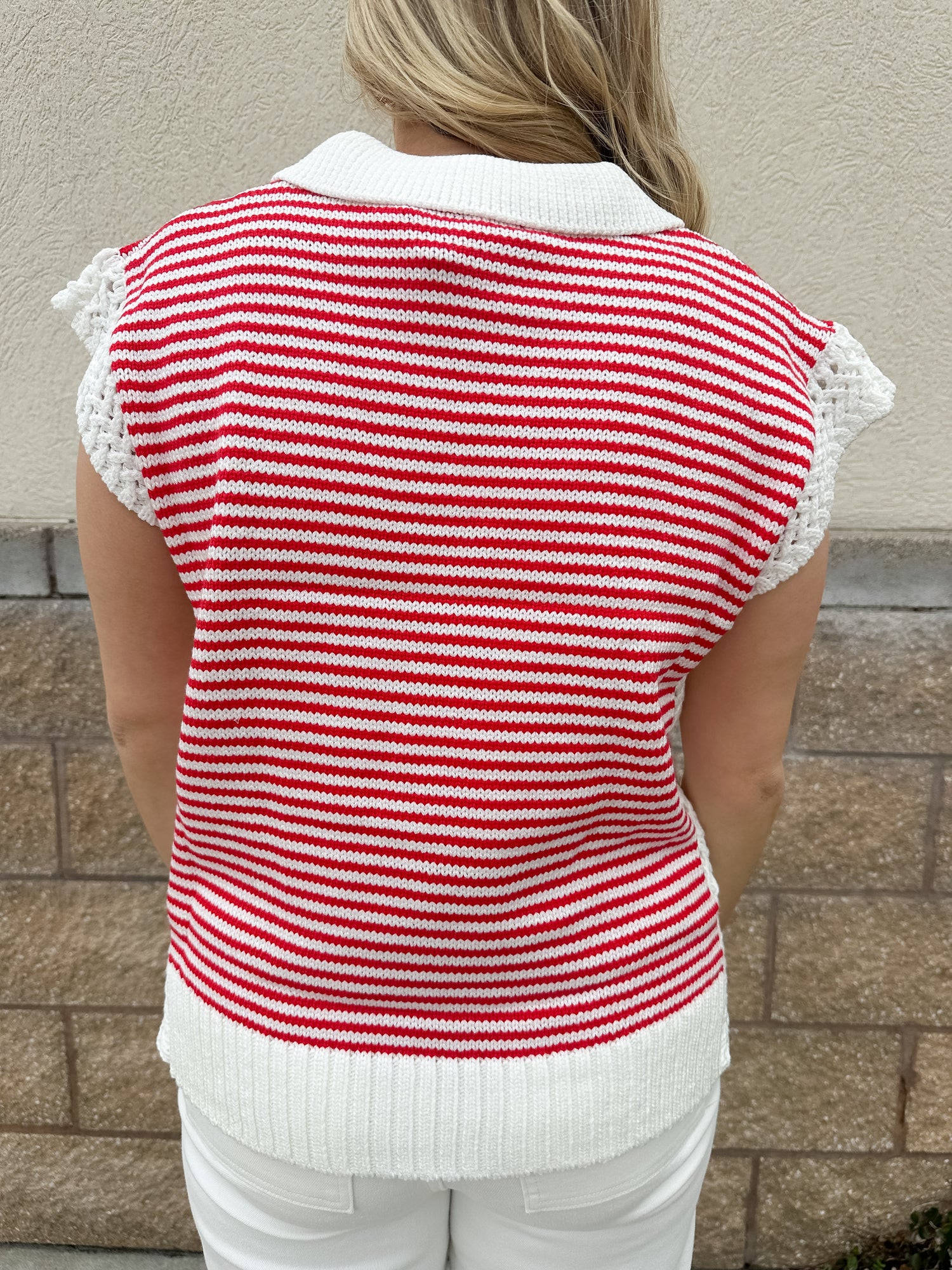 The Cassidy Striped Top from Karlie is a v-neck sleeveless red and white striped top with a collar that features crochet detailing on the sides.