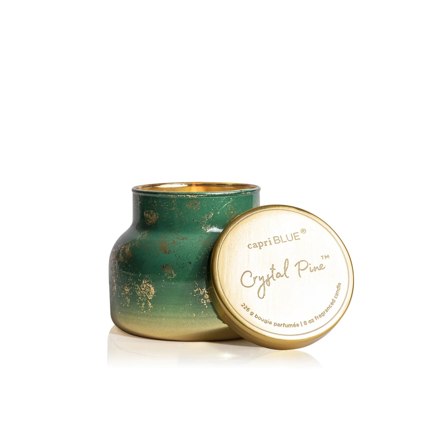 The Crystal Pine Petite Candle is showstopper wrapped in beautiful emerald green with touches of gold. It's filled with winter notes of frosted fir, snowy woods, pine and sage that will brighten up any room! 8 OZ