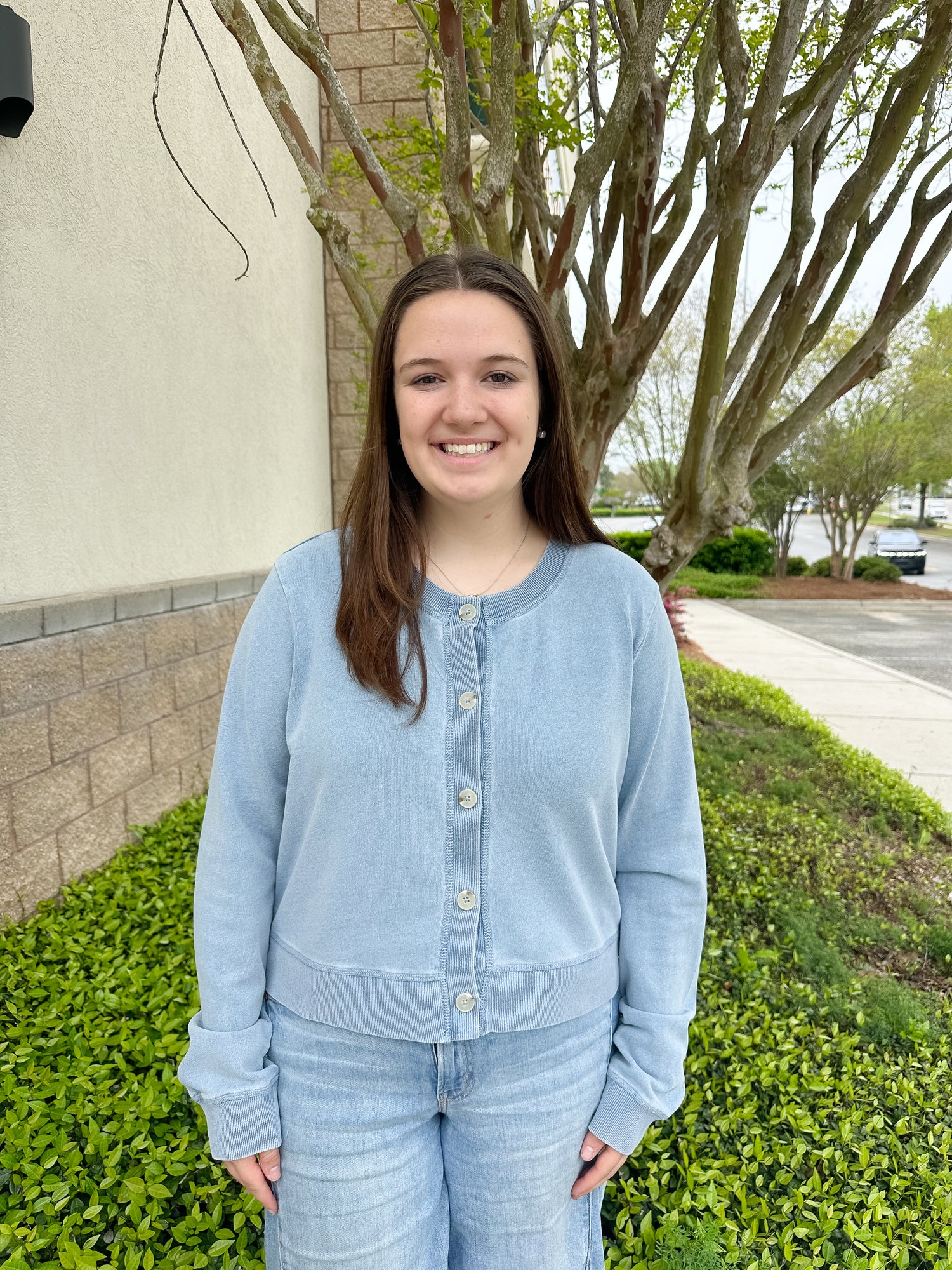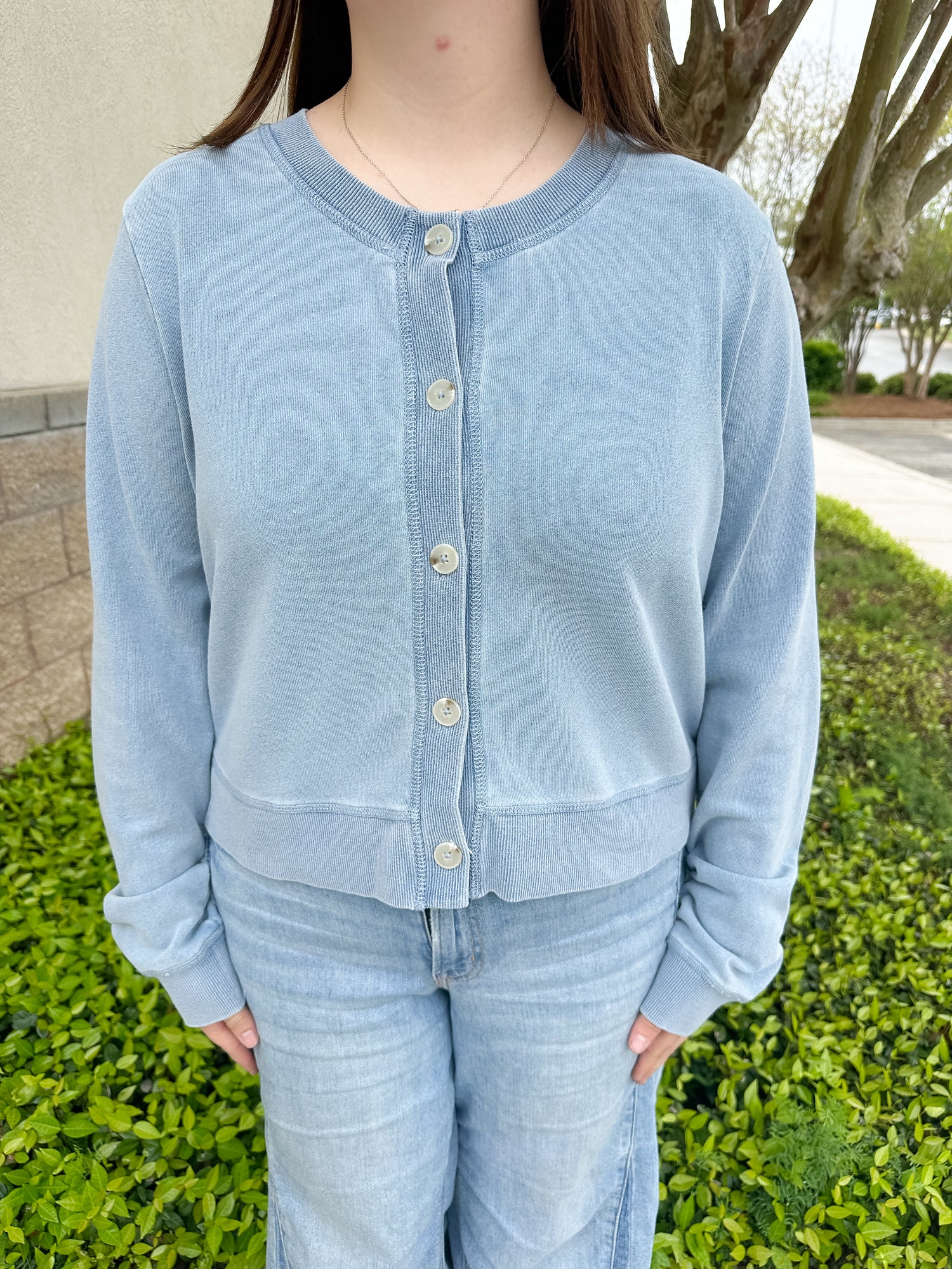This relaxed cardigan is made from knit denim french terry, featuring a versatile crew neckline and easy-going silhouette. So comfortable, it just may become your new favorite laid-back layer.