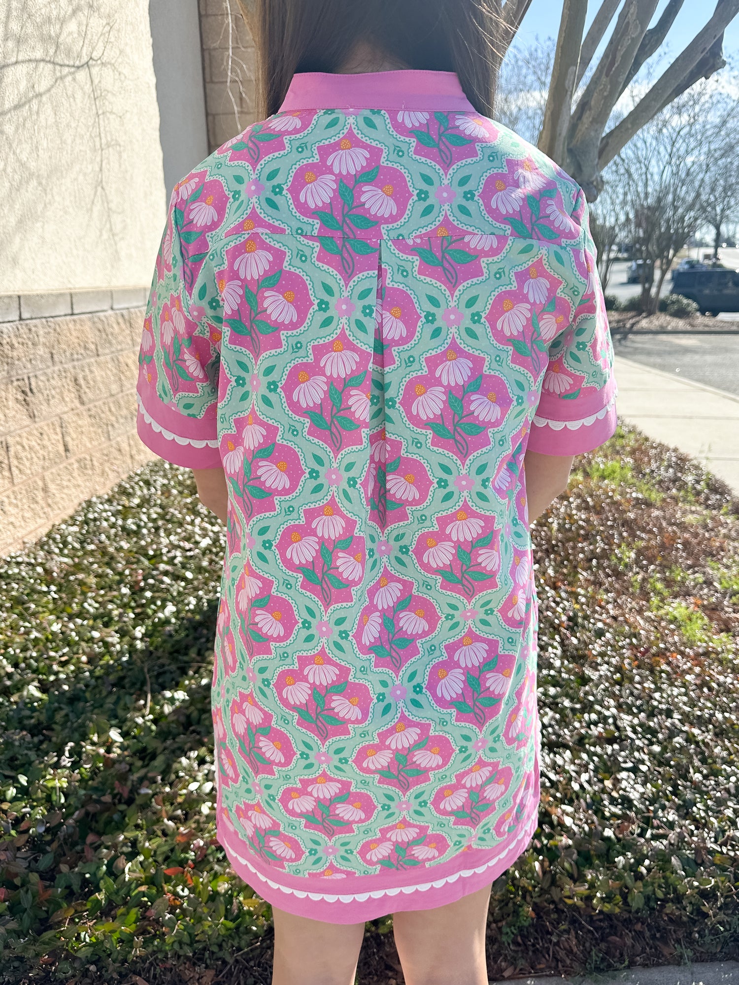 The Evie Shift Dress from TCEC is a mini colorful floral print contrast shift dress with ric rac trimming.