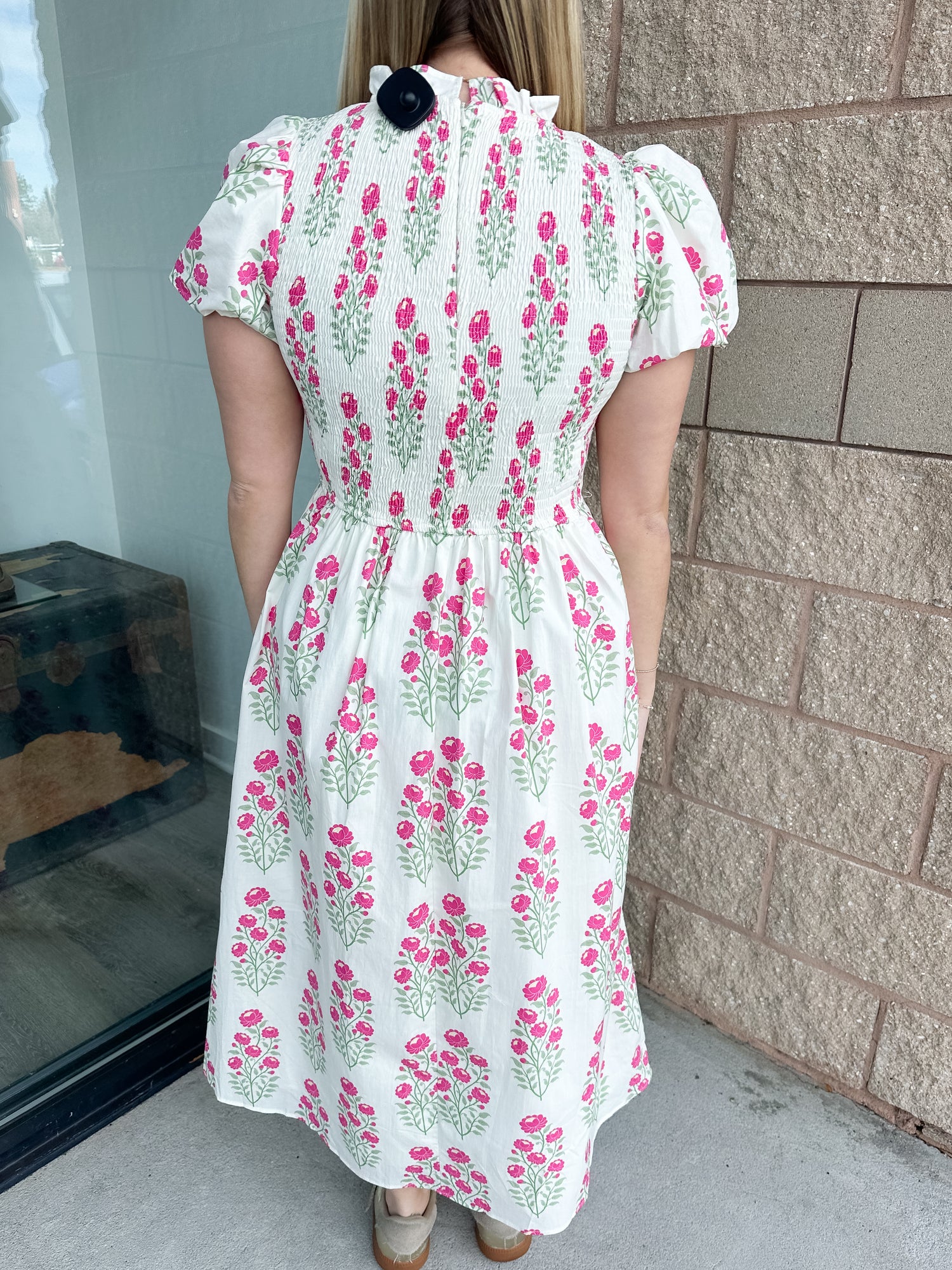 The Gemma Midi Dress from TCEC is a floral printed smocked bodice high neck midi dress.