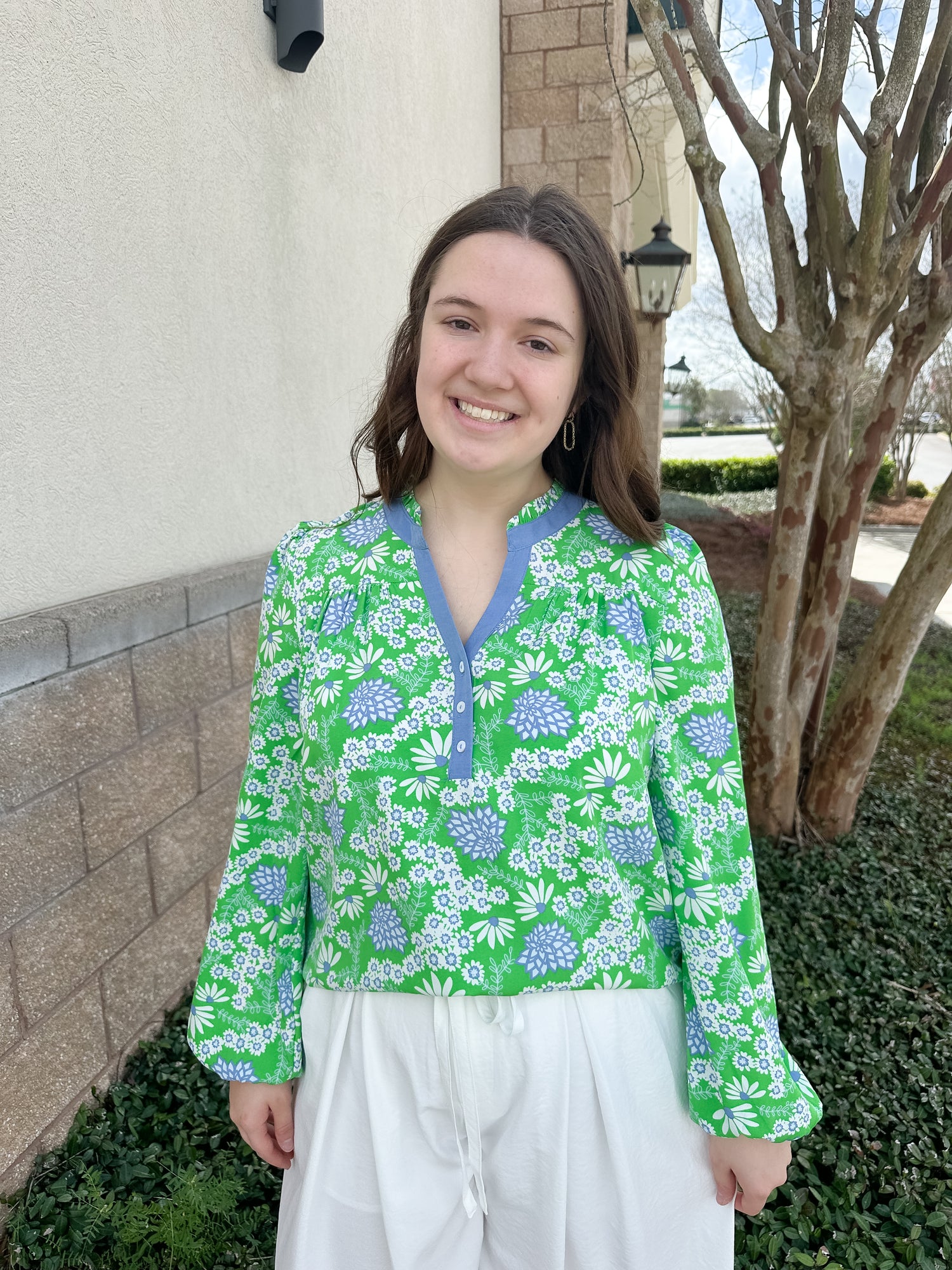 The Gianna Top adds personality to an everyday essential. Designed with a button-front placket, long sleeves with elastic cuffs, and a ruffle neckline, it’s easy to wear and full of charm. Pair it with your favorite denim for laid-back days or style it with tailored pieces for a dressed-up look that still feels effortless.