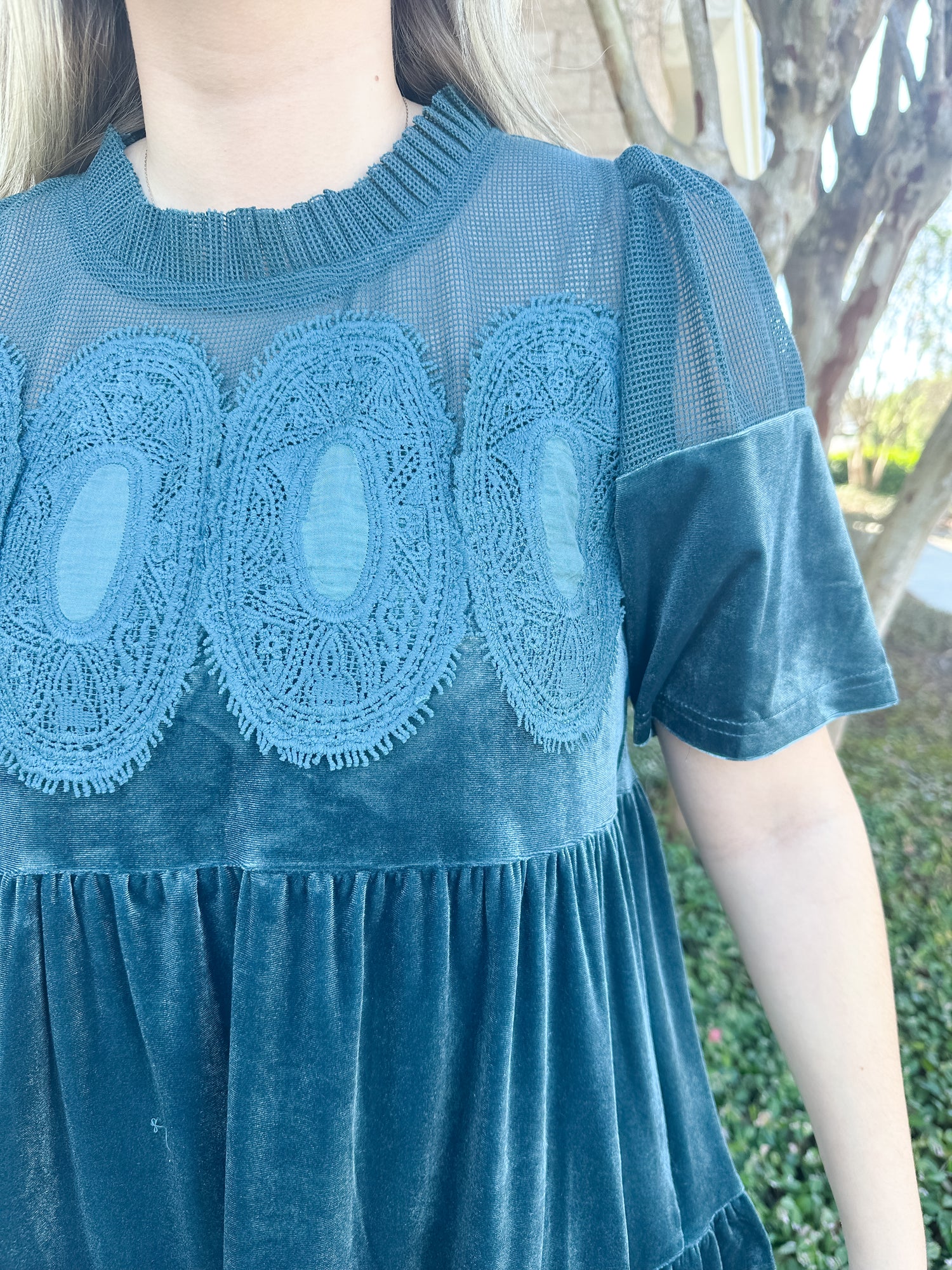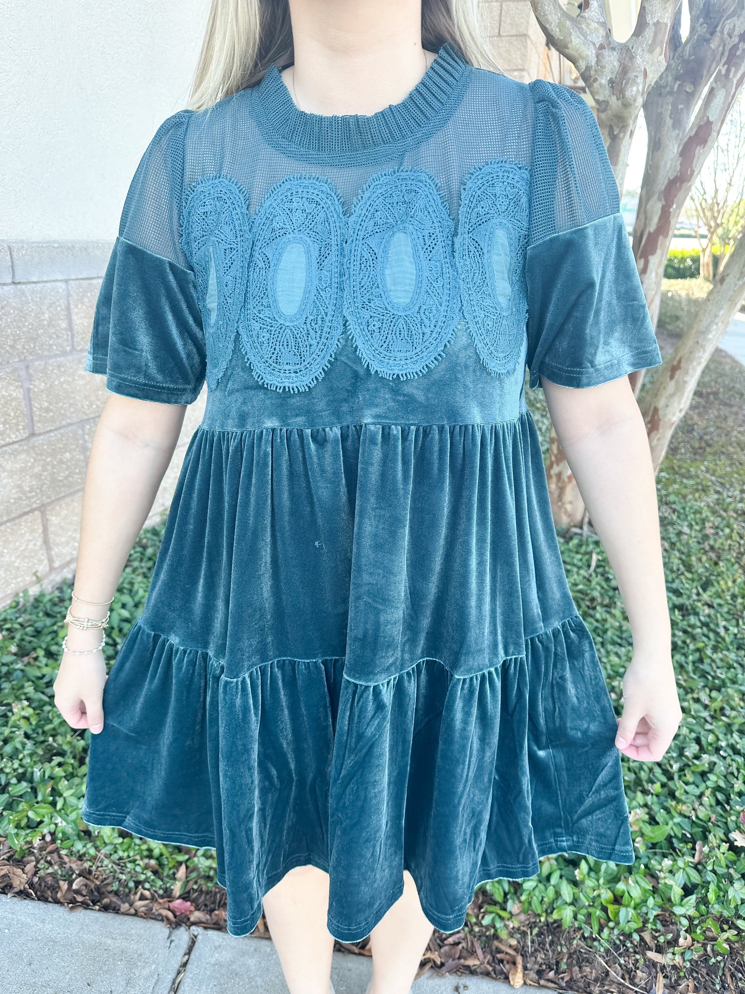 The Hannah Velvet Mini Dress has gorgeous lace detailing perfect for your next event. Sizes S-L available.