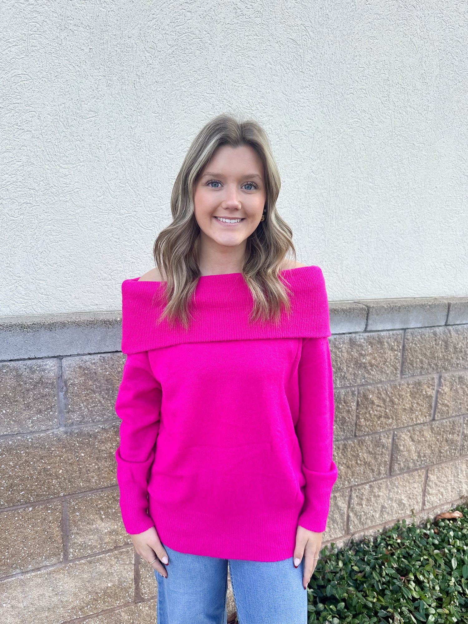 A bold and beautiful off-shoulder sweater in vibrant hot pink, featuring a wide foldover neckline and a soft, cozy knit. Perfect for adding a fun pop of color to your winter wardrobe.