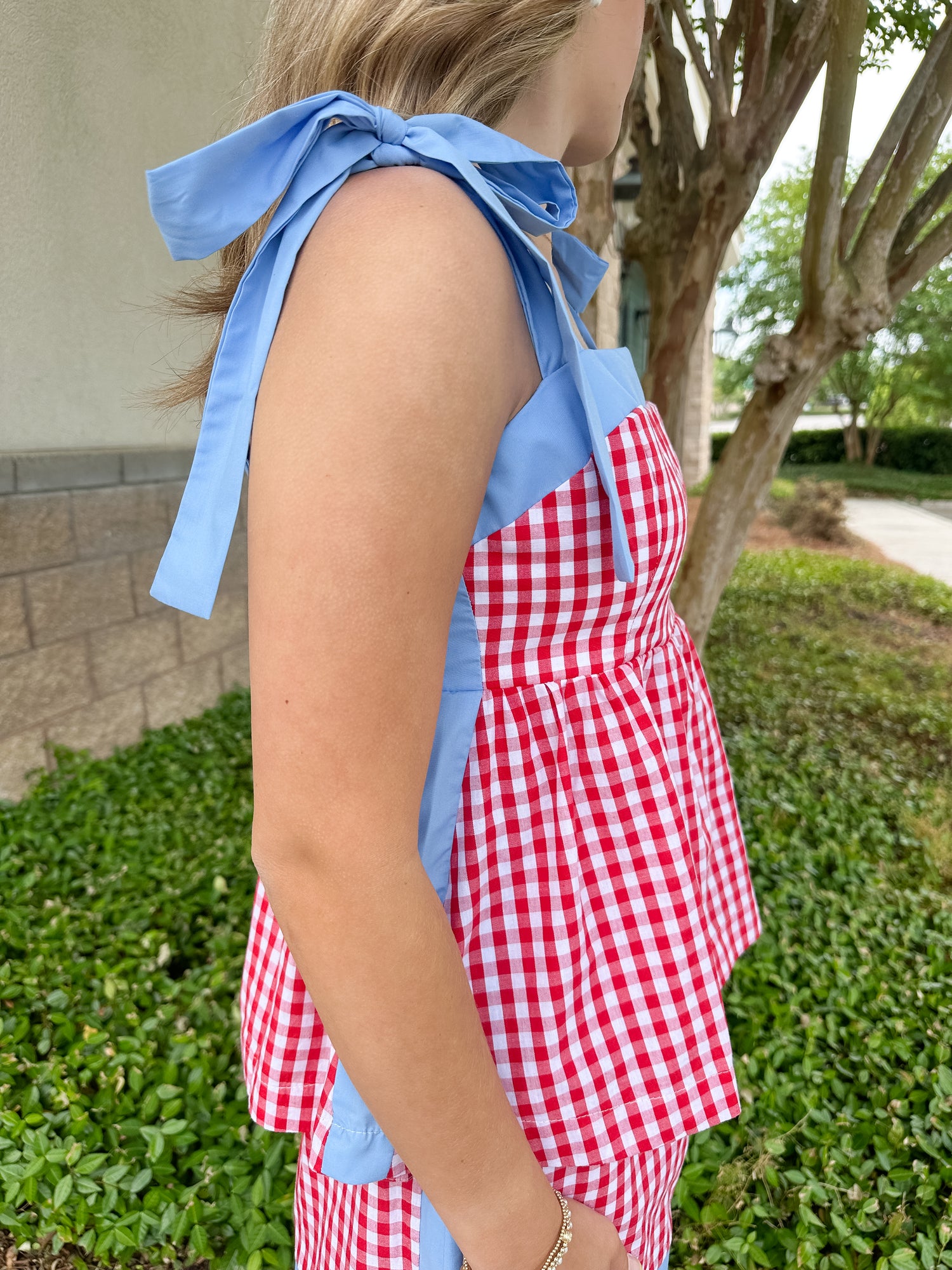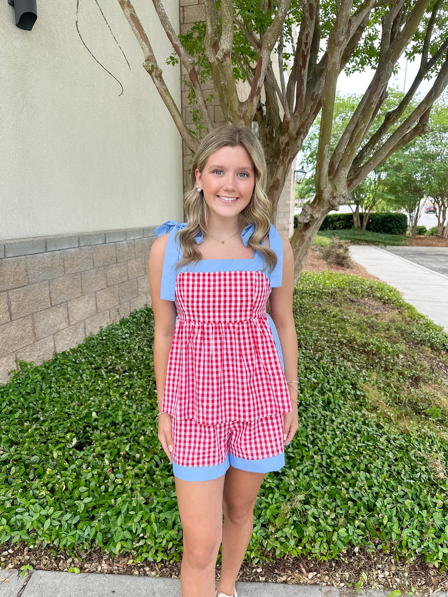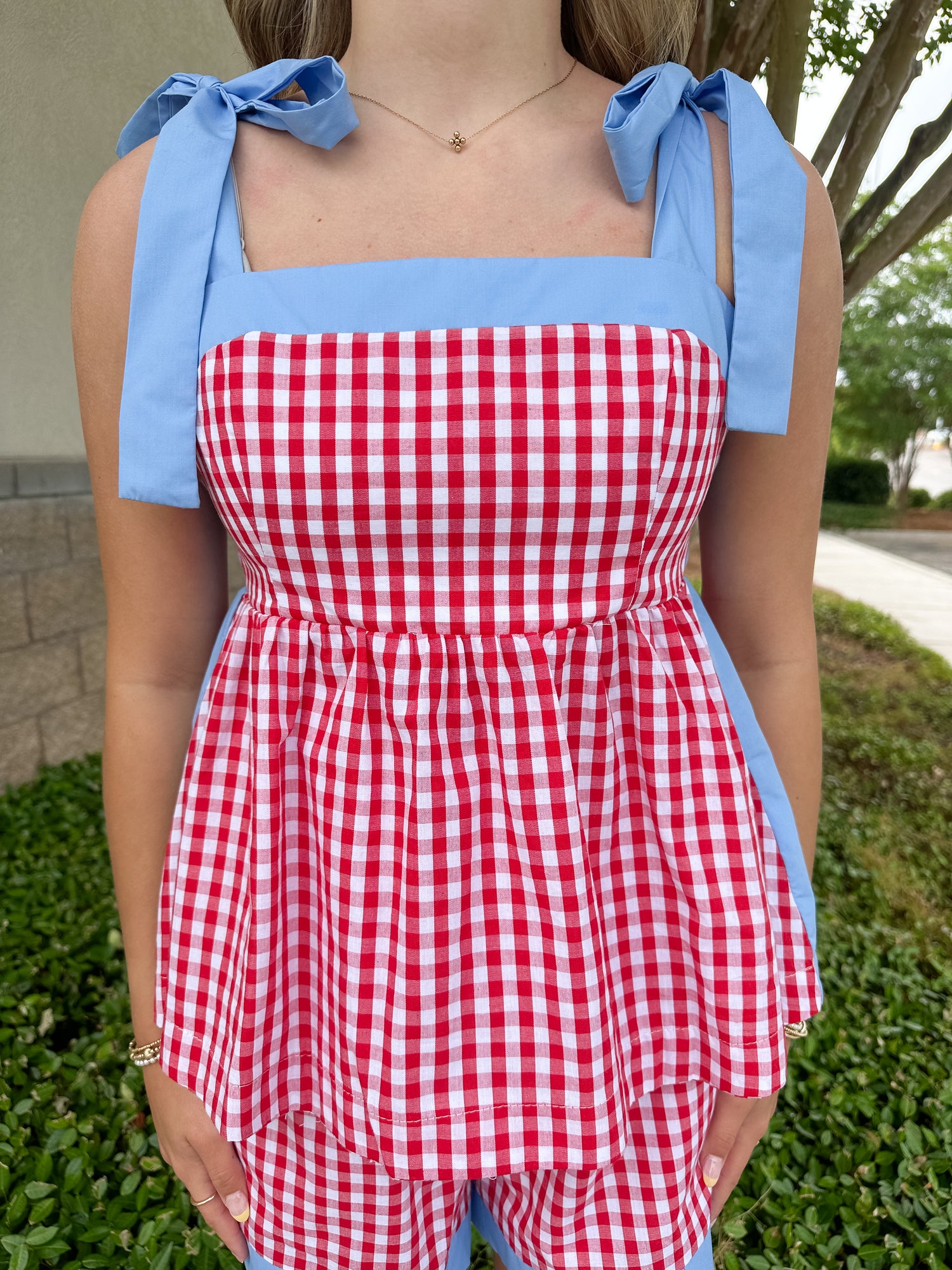 The Independence Set from Entro is a red, white and blue gingham printed set that comes with a smocked tank top and shorts.