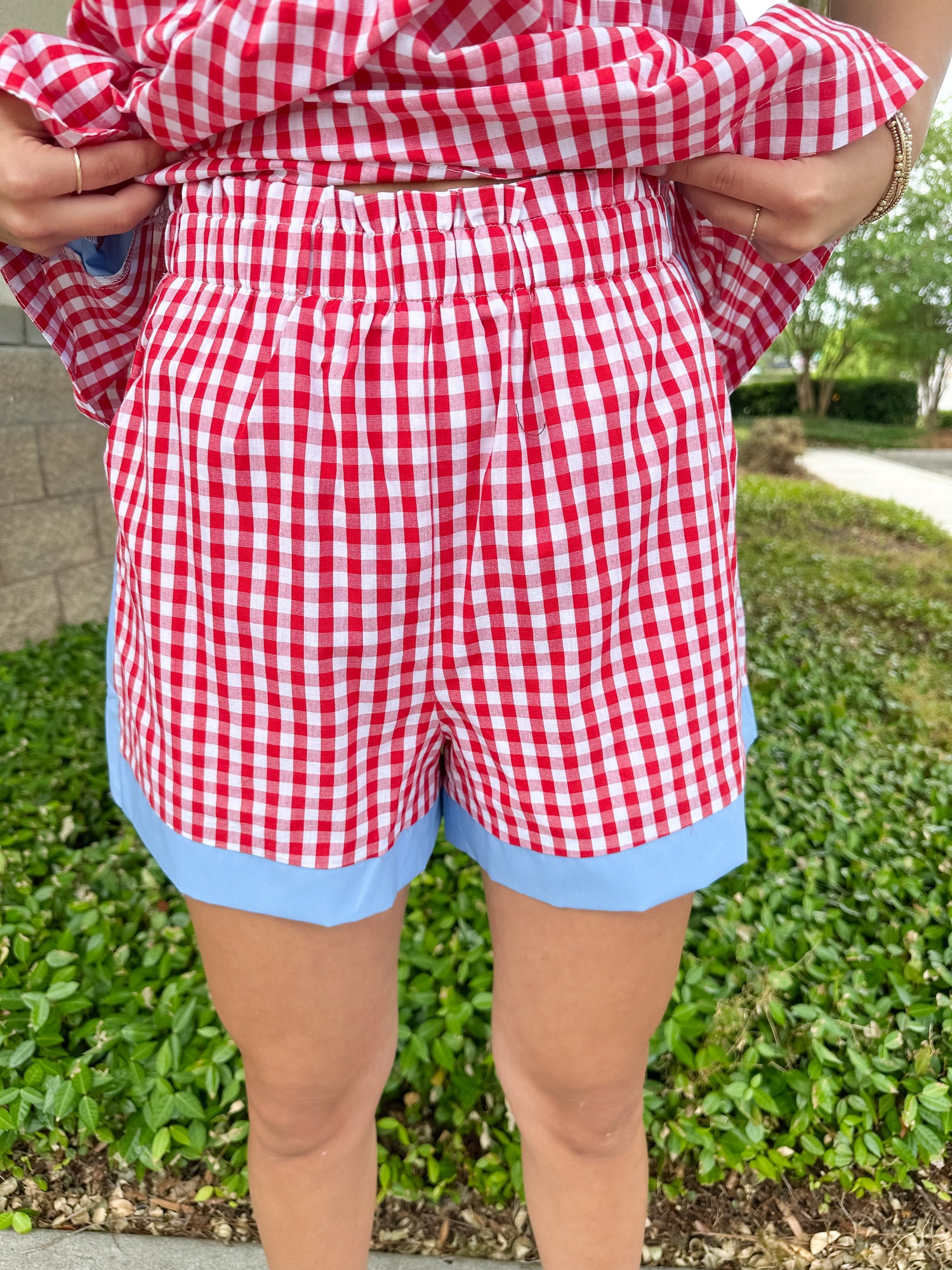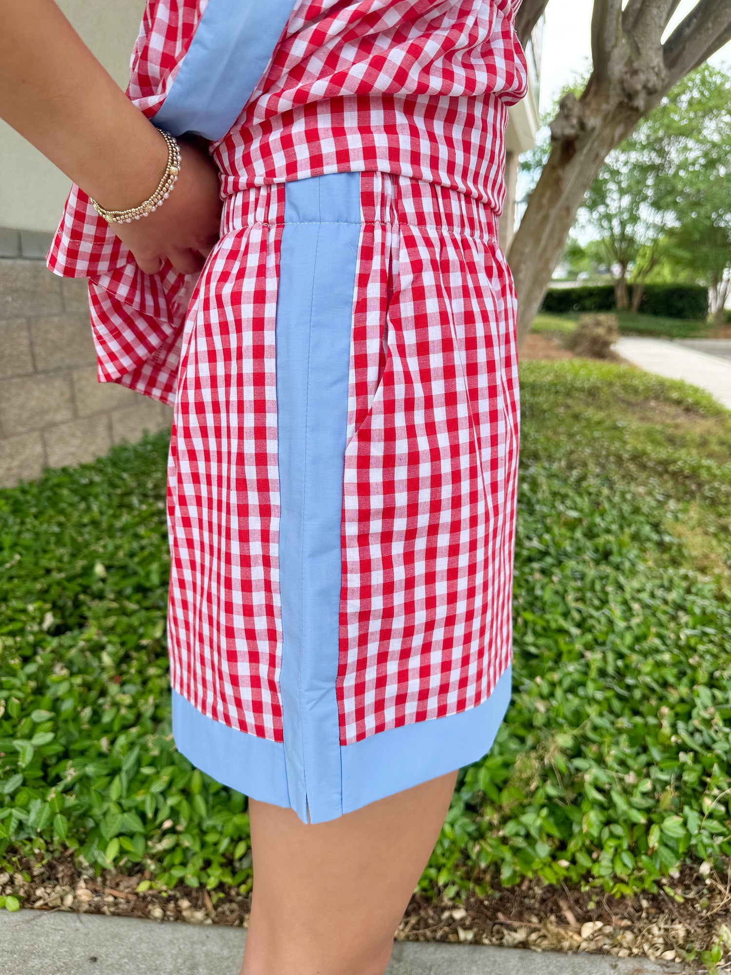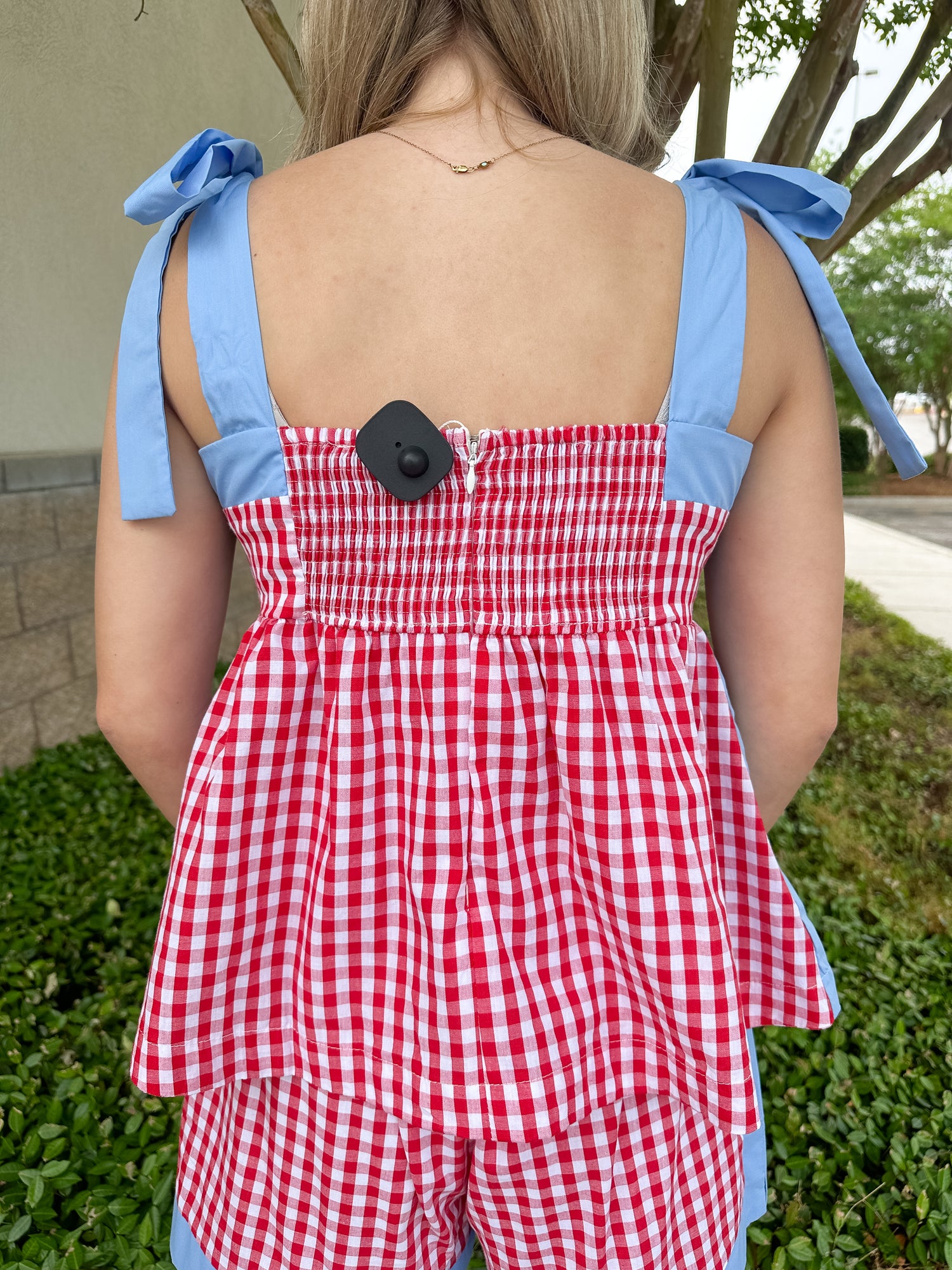 The Independence Set from Entro is a red, white and blue gingham printed set that comes with a smocked tank top and shorts.