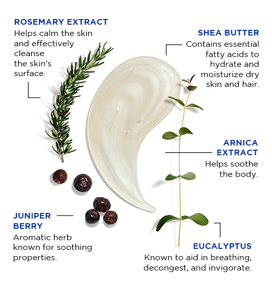 Rosemary Extract: Helps calm the skin and effectively cleanse the skin's surface.Eucalyptus: Known to aid in breathing, decongest, and invigorate.