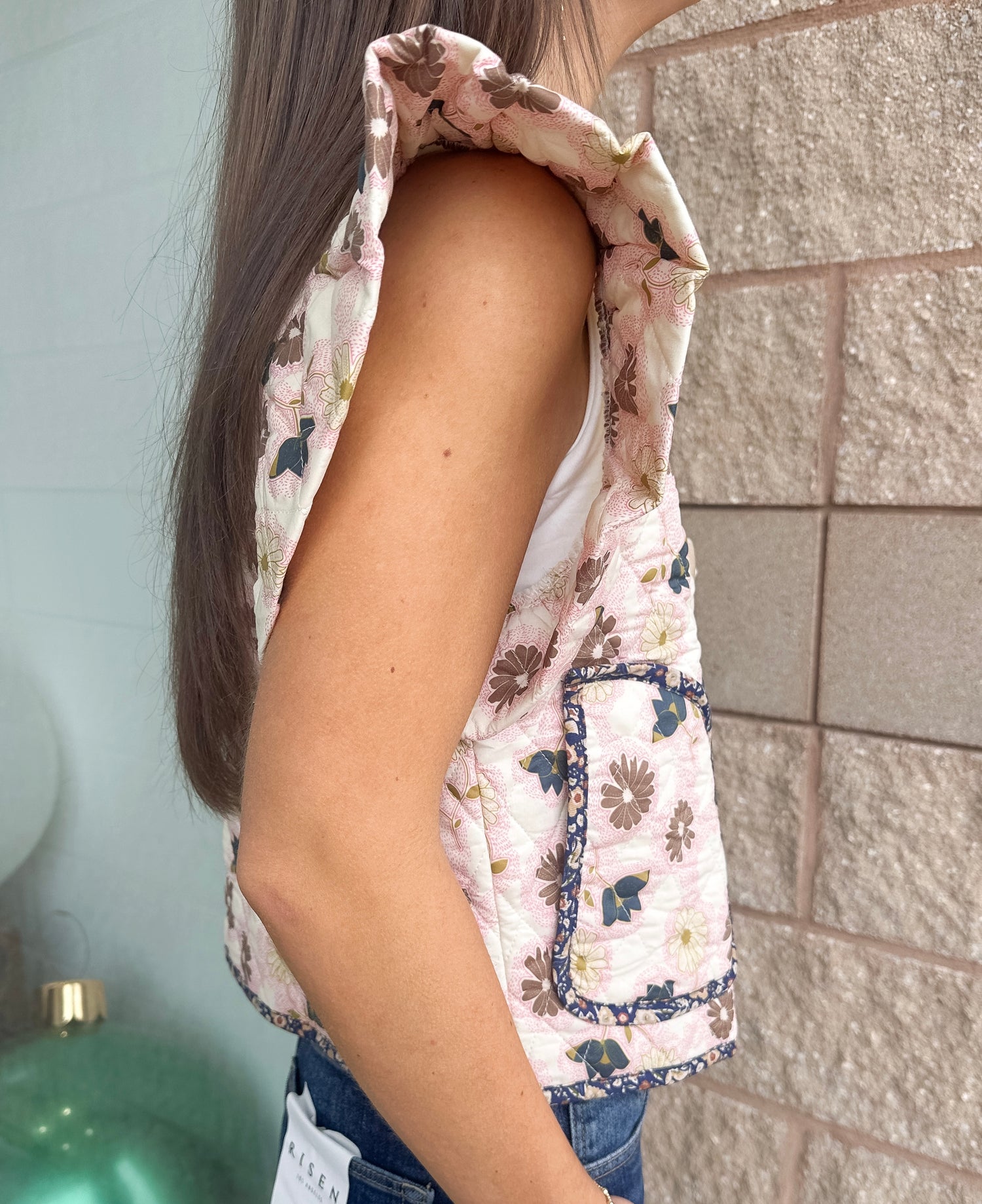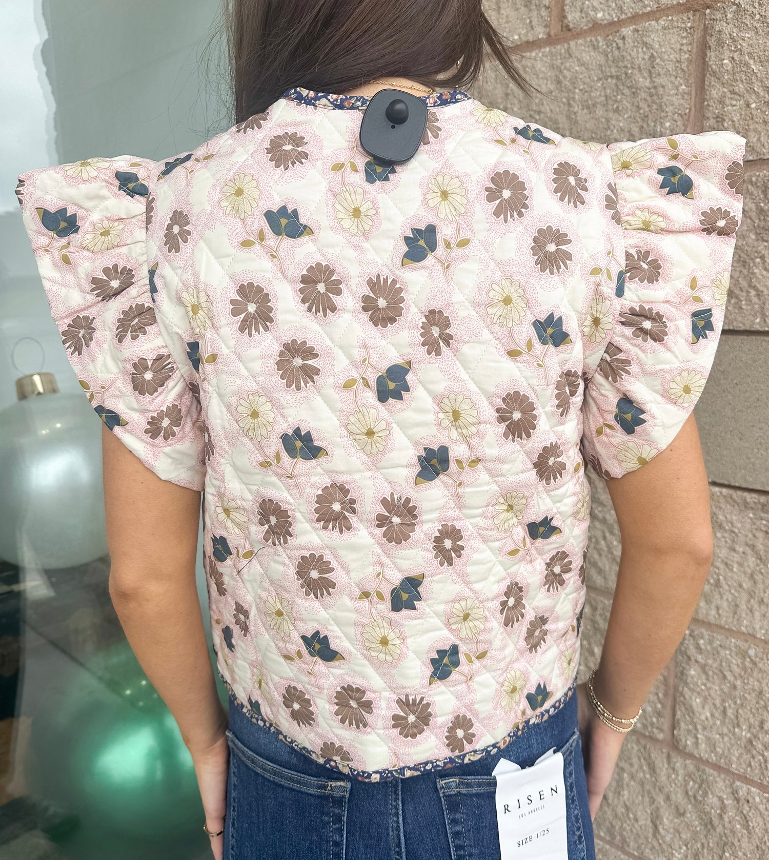 The Jackie Quilted Vest from Entro has the perfect ruffled sleeves with quilted floral print.