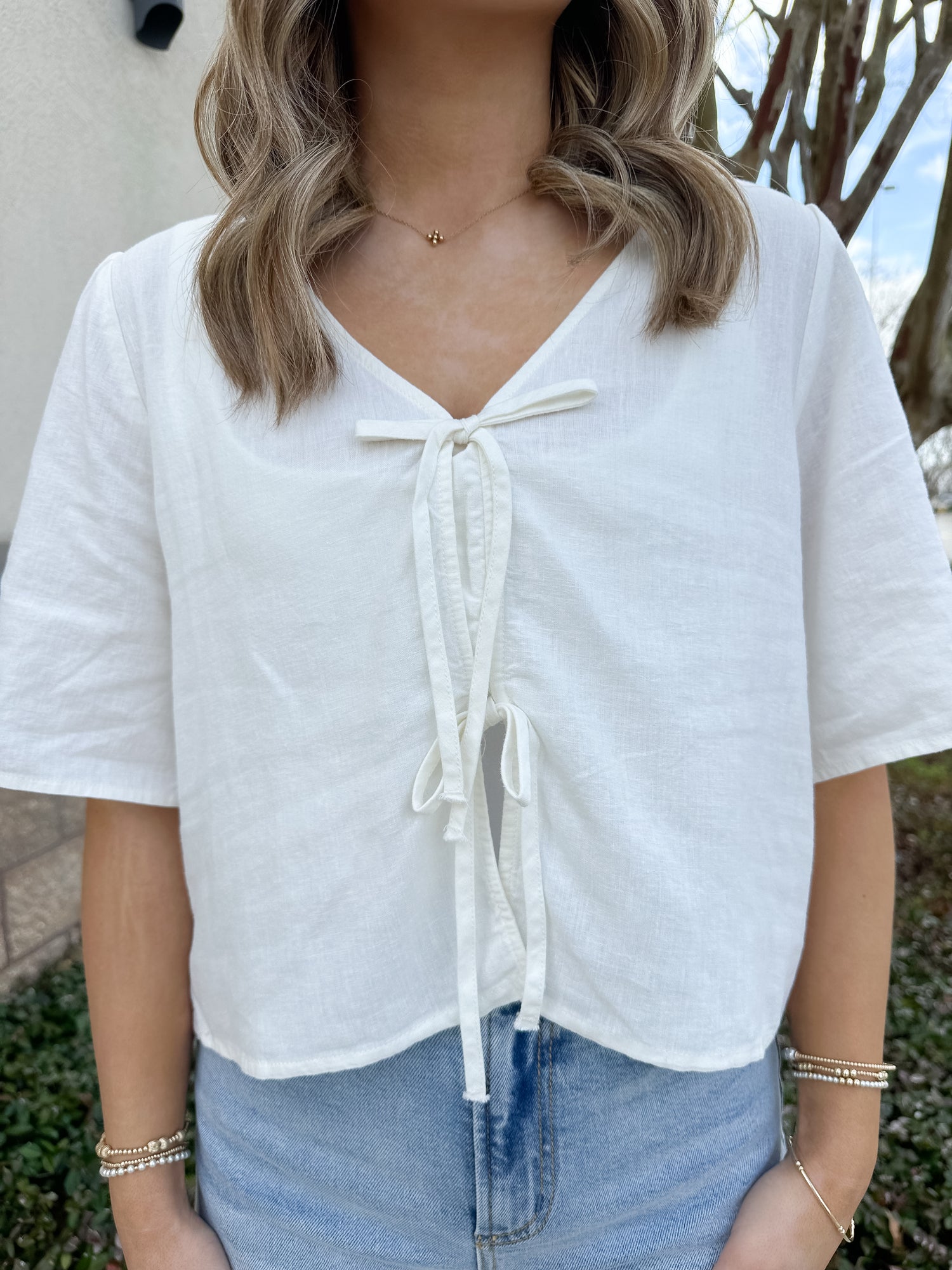 This feminine top is an instant favorite with its washed linen blend fabric, flattering relaxed fit, and tie front, finished with a modesty placket for easy coverage. Made to be dressed up or down, try it with denim or linen pants