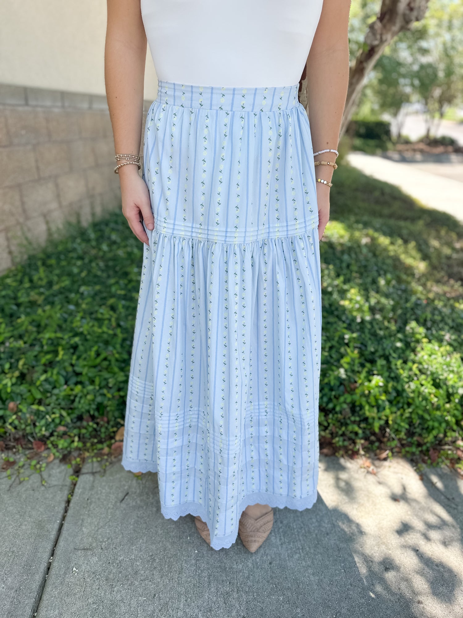 The margaret maxi skirt is such a beautiful addition to any wardrobe. This skirt features floral prints, lace, and an elastic waistband.