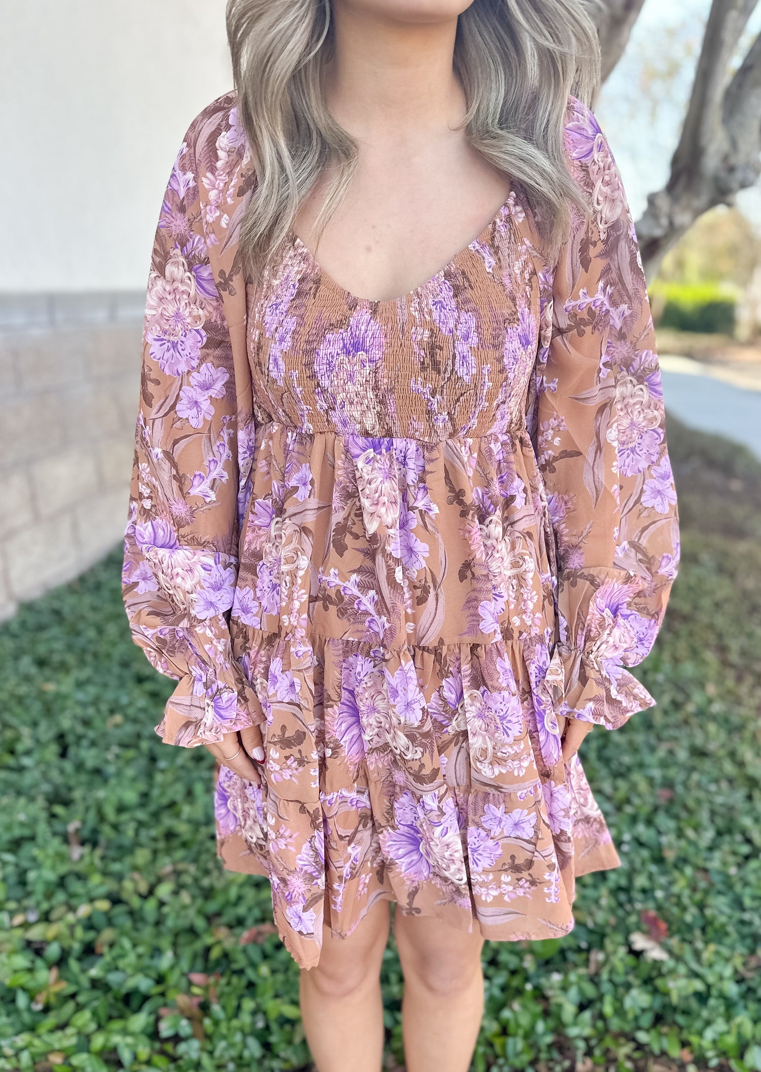 A gorgeous floral mini dress featuring a smocked bodice, tiered ruffle skirt, and billowy long sleeves. The warm caramel base with soft lilac florals makes it perfect for brunch, showers, or any sweet seasonal outing.