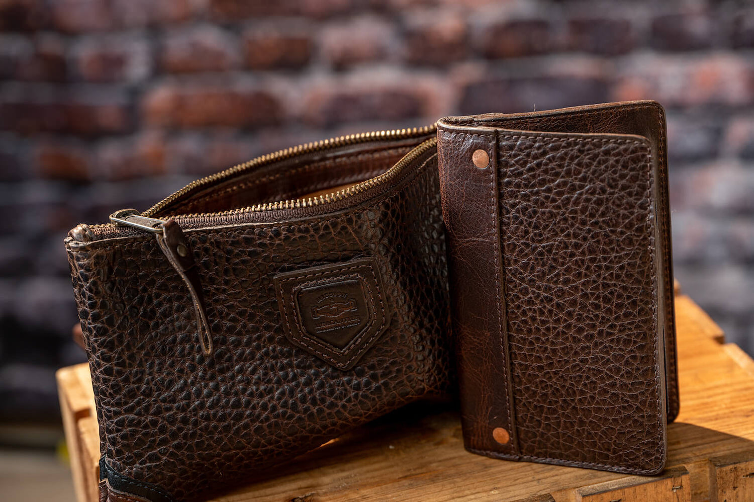 - Handcrafted with our signature thick, supple full-grain US steerhide Espresso pebbled leather