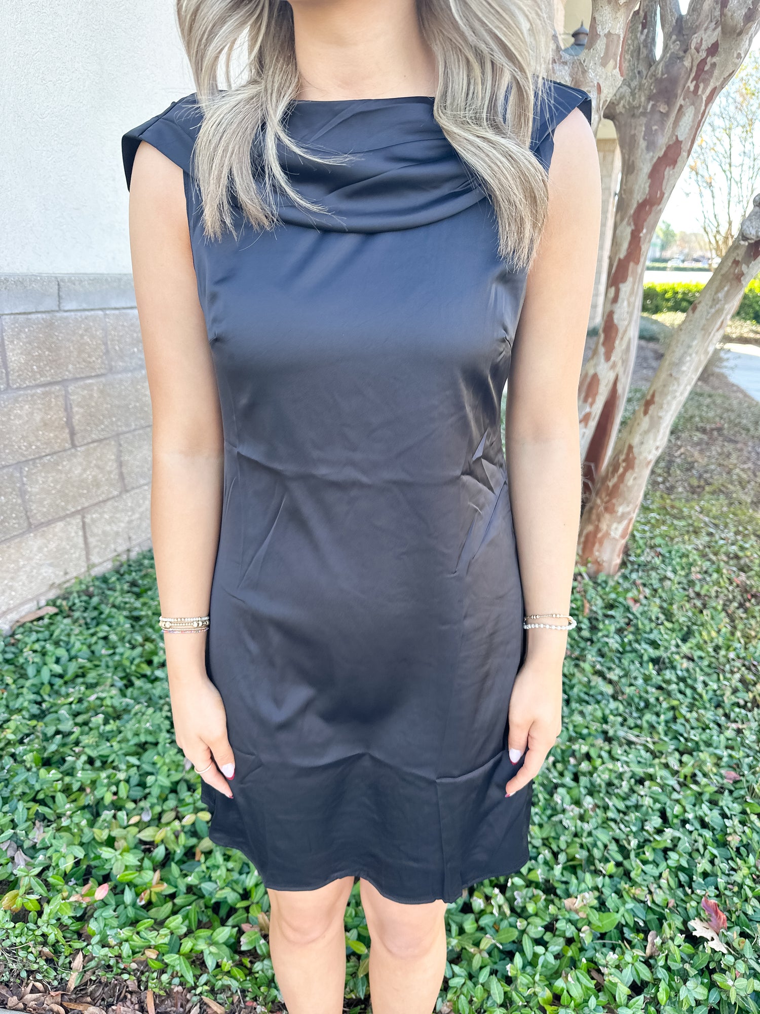 Effortlessly chic, the Nancy Satin Drape Dress features a luxurious soft sheen and elegant draped detailing along both the front and back. With its sleek silhouette and fluid movement, this timeless black dress is perfect for holiday parties, special events, and any night you want to shine with understated sophistication.