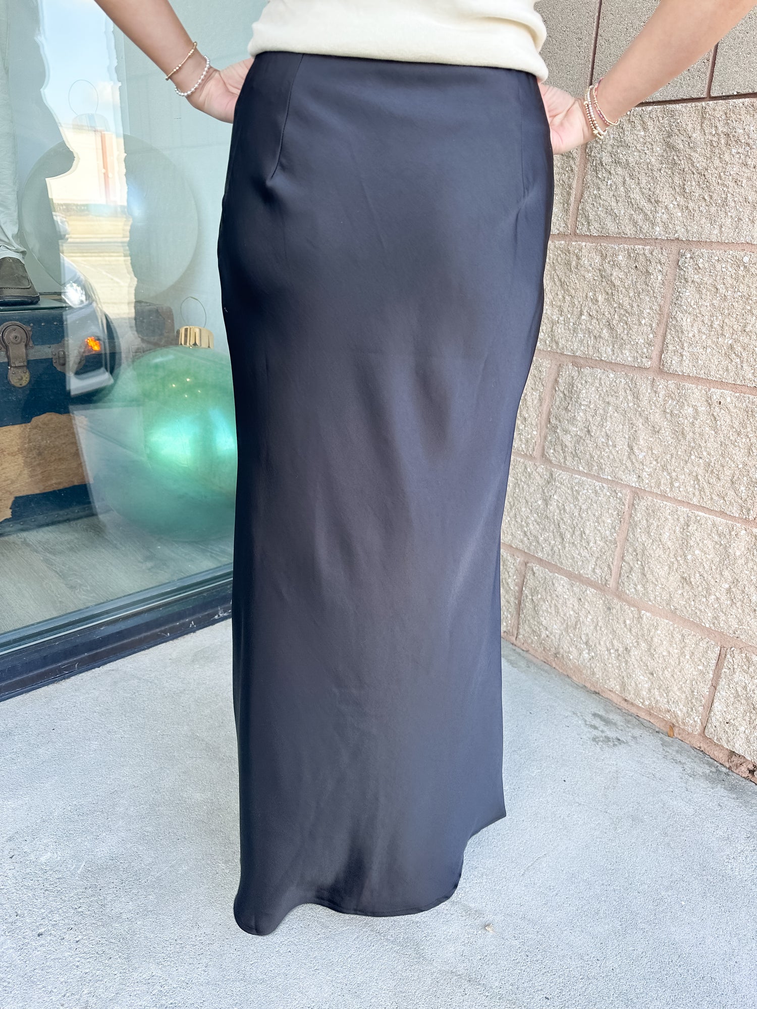 Sleek, silky, and effortlessly chic — this satin midi skirt drapes beautifully for a smooth, flattering fit. Perfect for dressing up or pairing with a casual knit, it’s a timeless staple for any season.