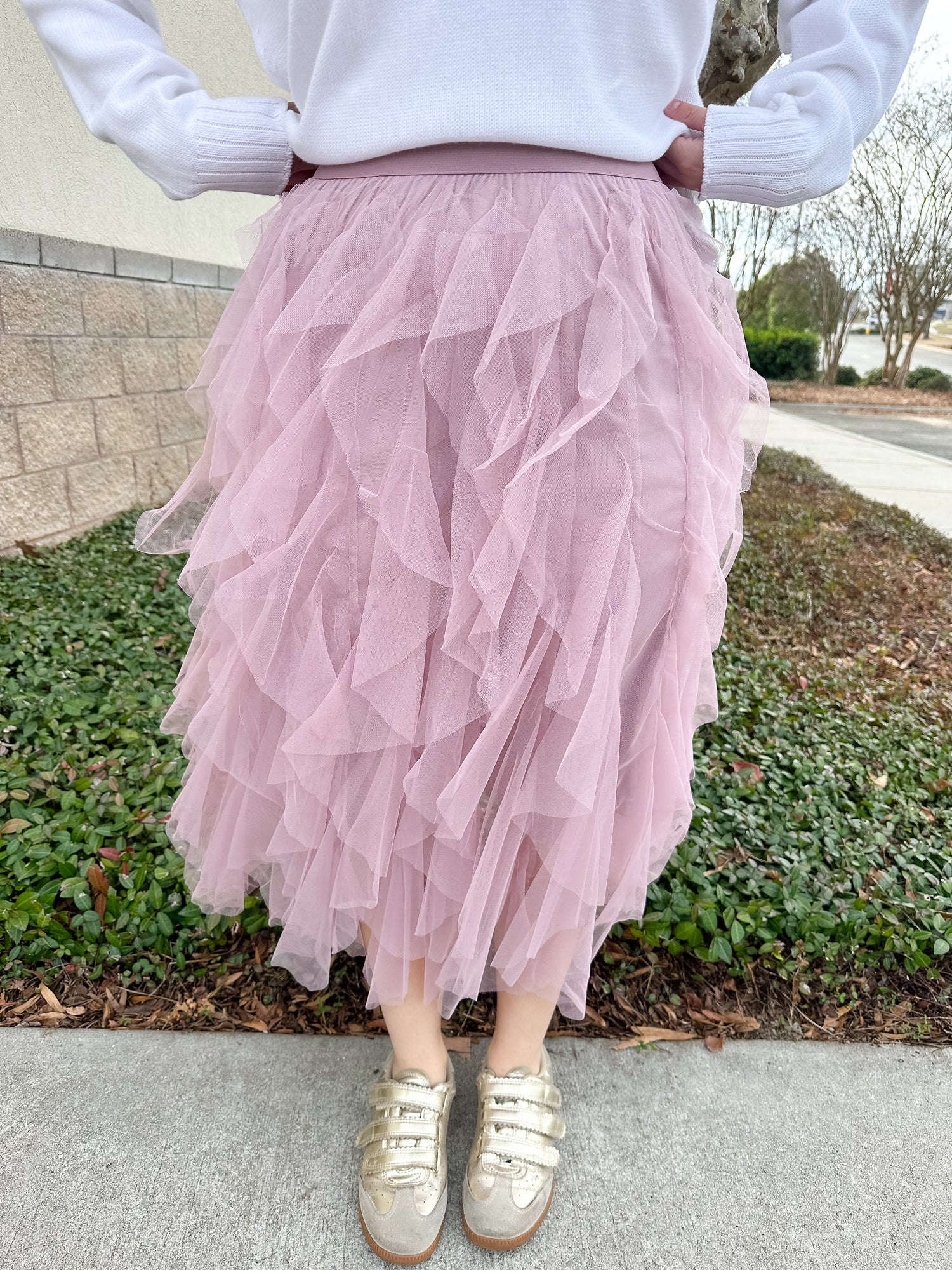 The Penelope Tulle Skirt is a midi ruffled tulle skirt in the prettiest rose color. Sizes S-L available.