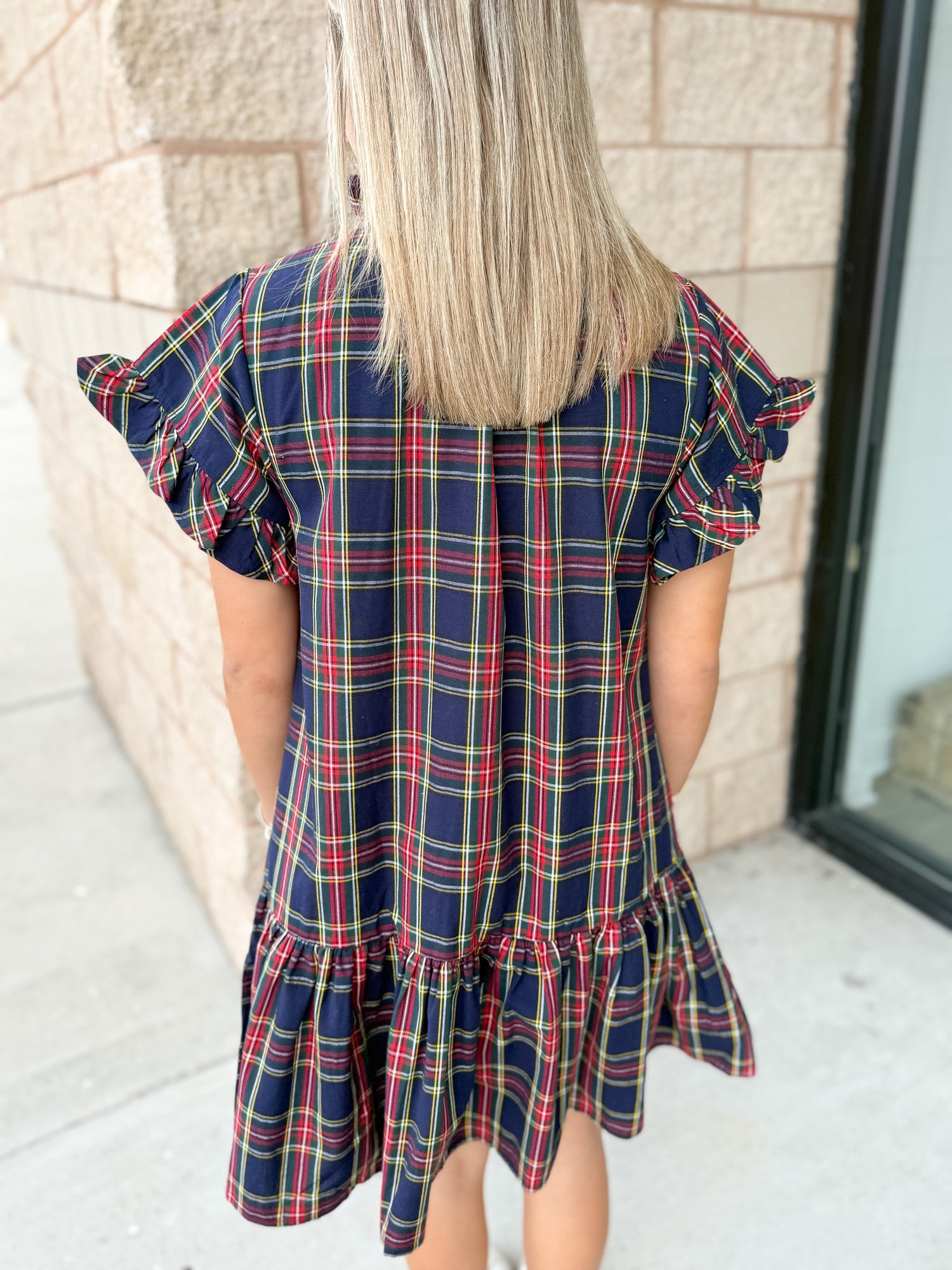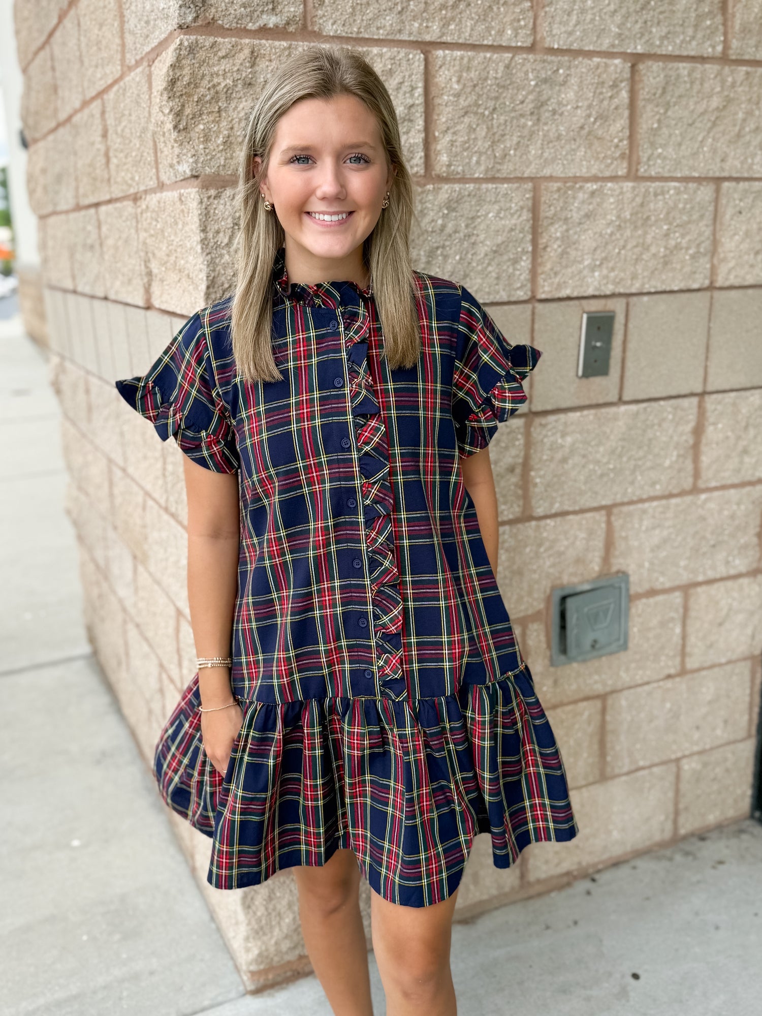 Plaid pattern ruffle accent button closure ruffle hem mini dress. Button closure at front. Side pockets. Lined. Woven. Non-sheer. Lightweight.