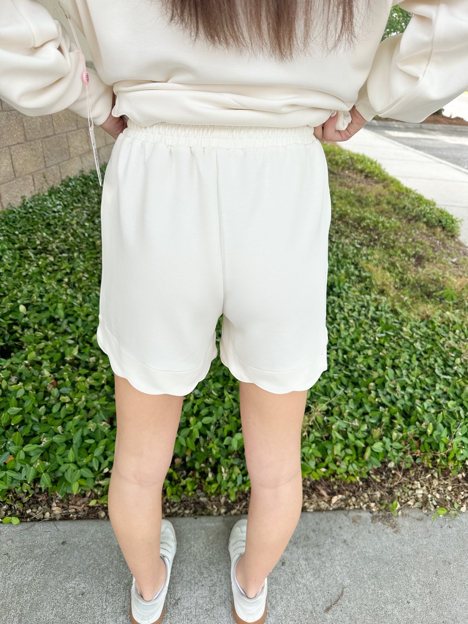 The Scalloped Short features on seam slanted pockets, an elasticated waistband, scallop hem detailing, and Simply Southern logo embroidery. Made of 48% modal, 48% polyester, and 4% spandex.