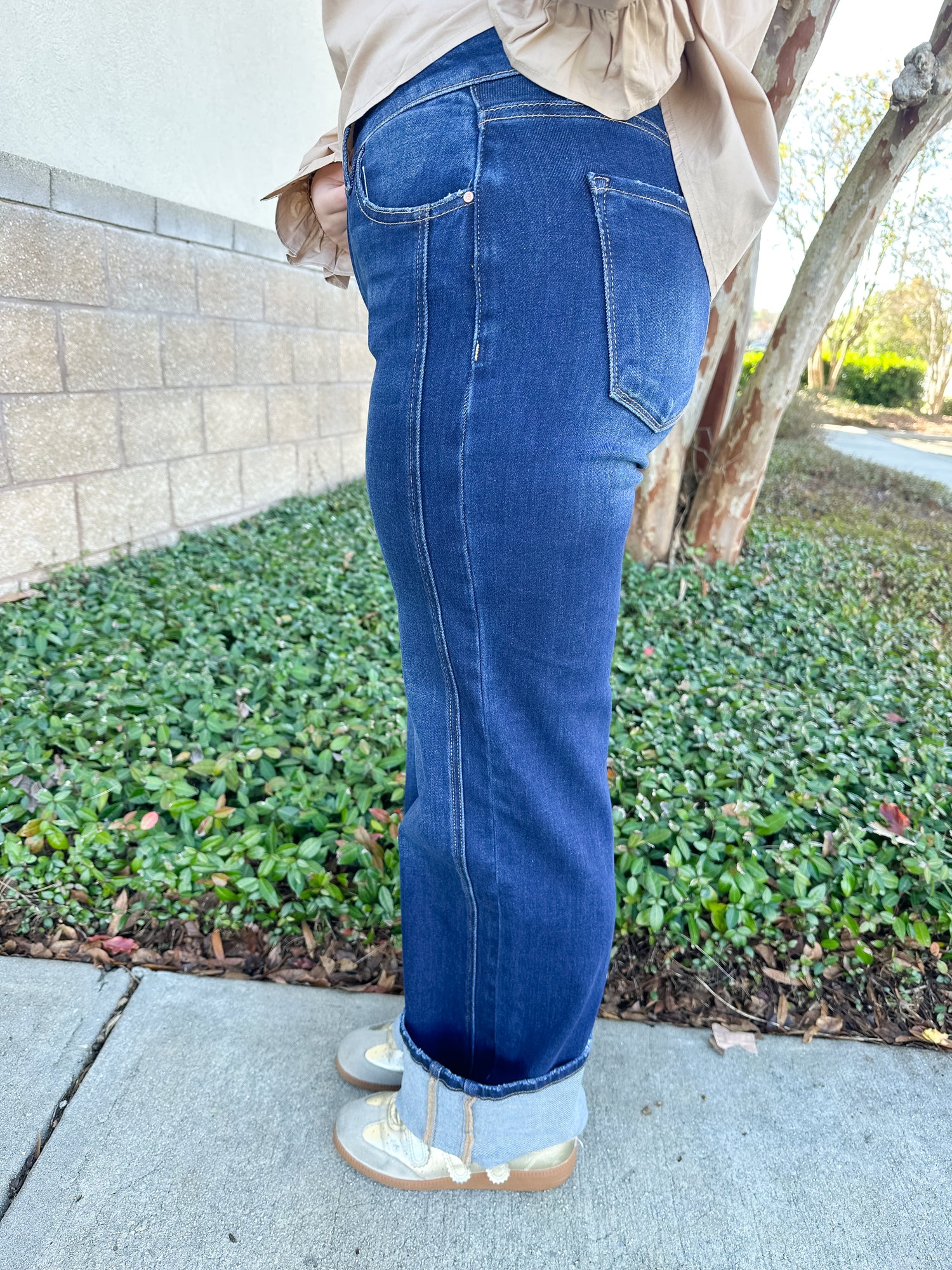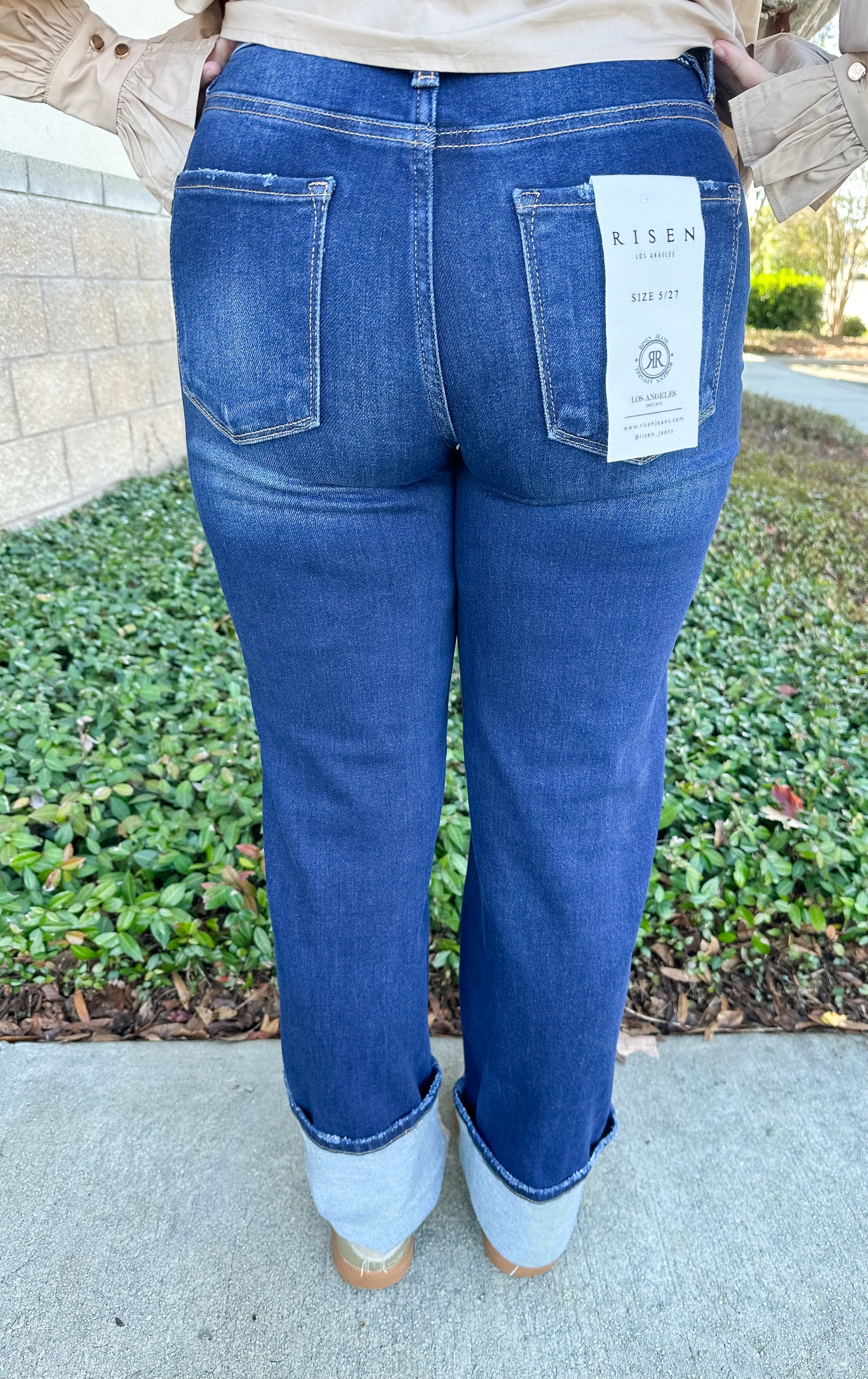 The Risen Addison Jeans are mid-rise, ankle straight, cuffed, and have a dark wash.