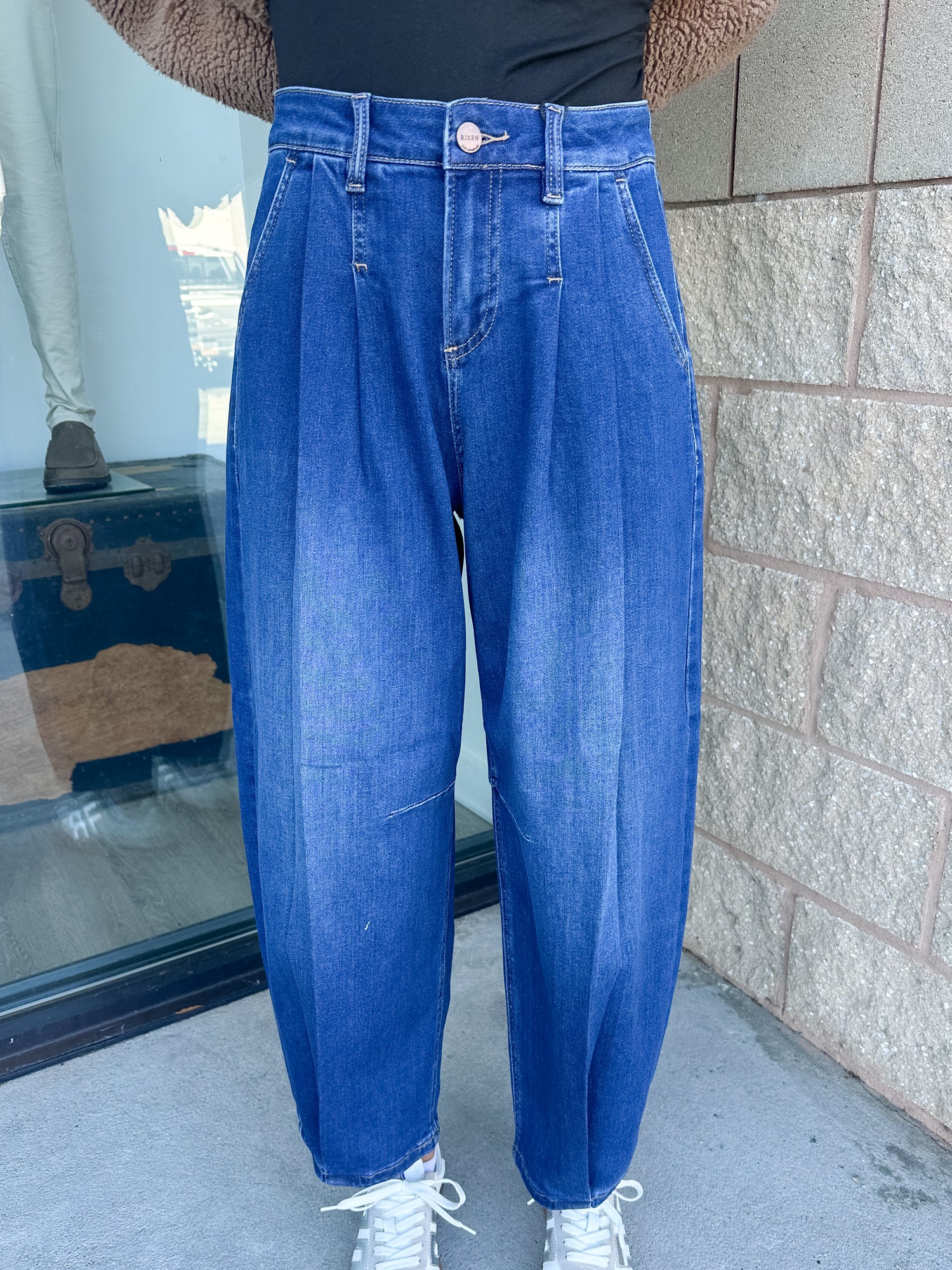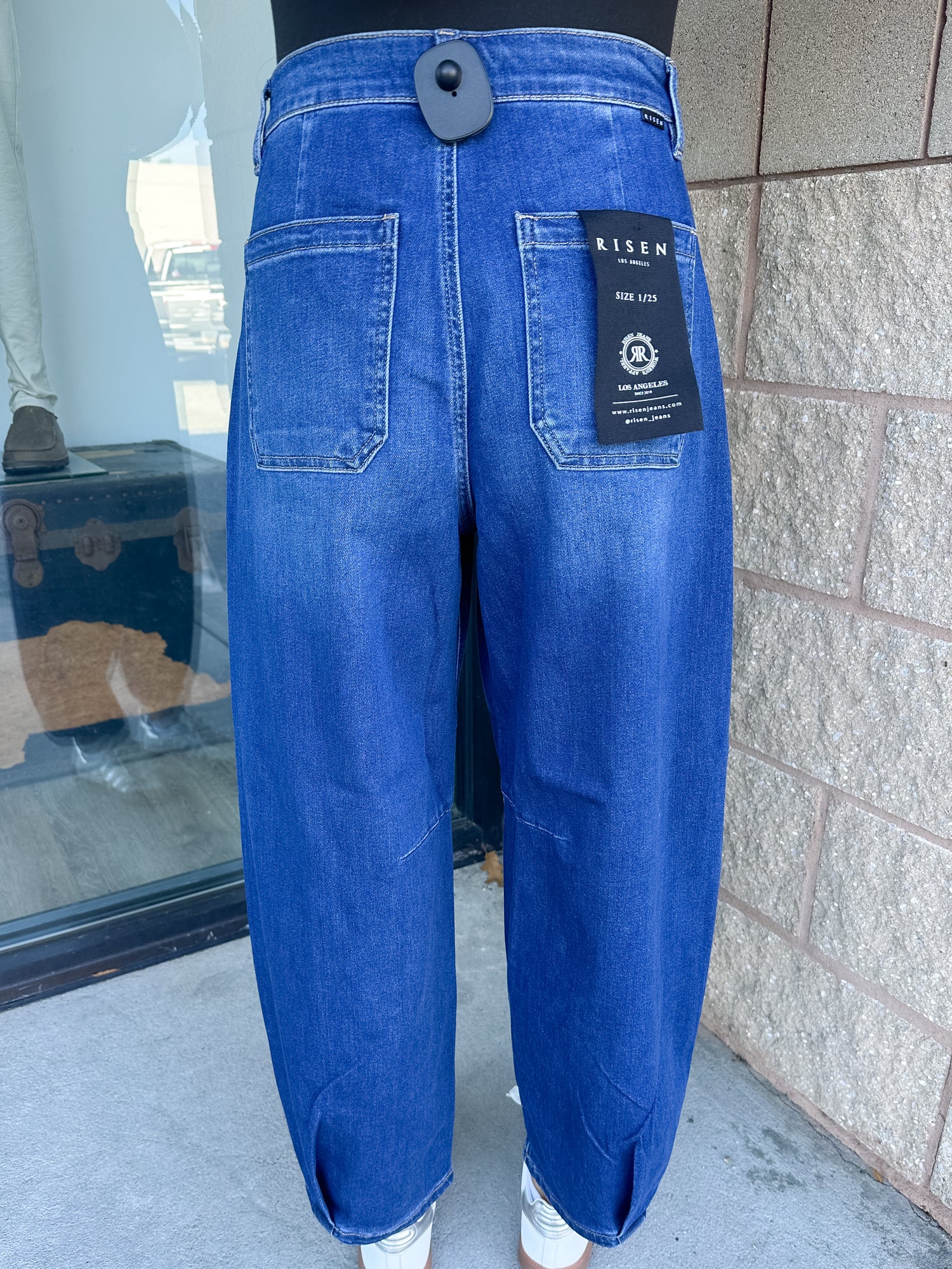 The Risen Hallie Jeans are dark wash, slouchy, crop, wide leg, barrel style jeans.