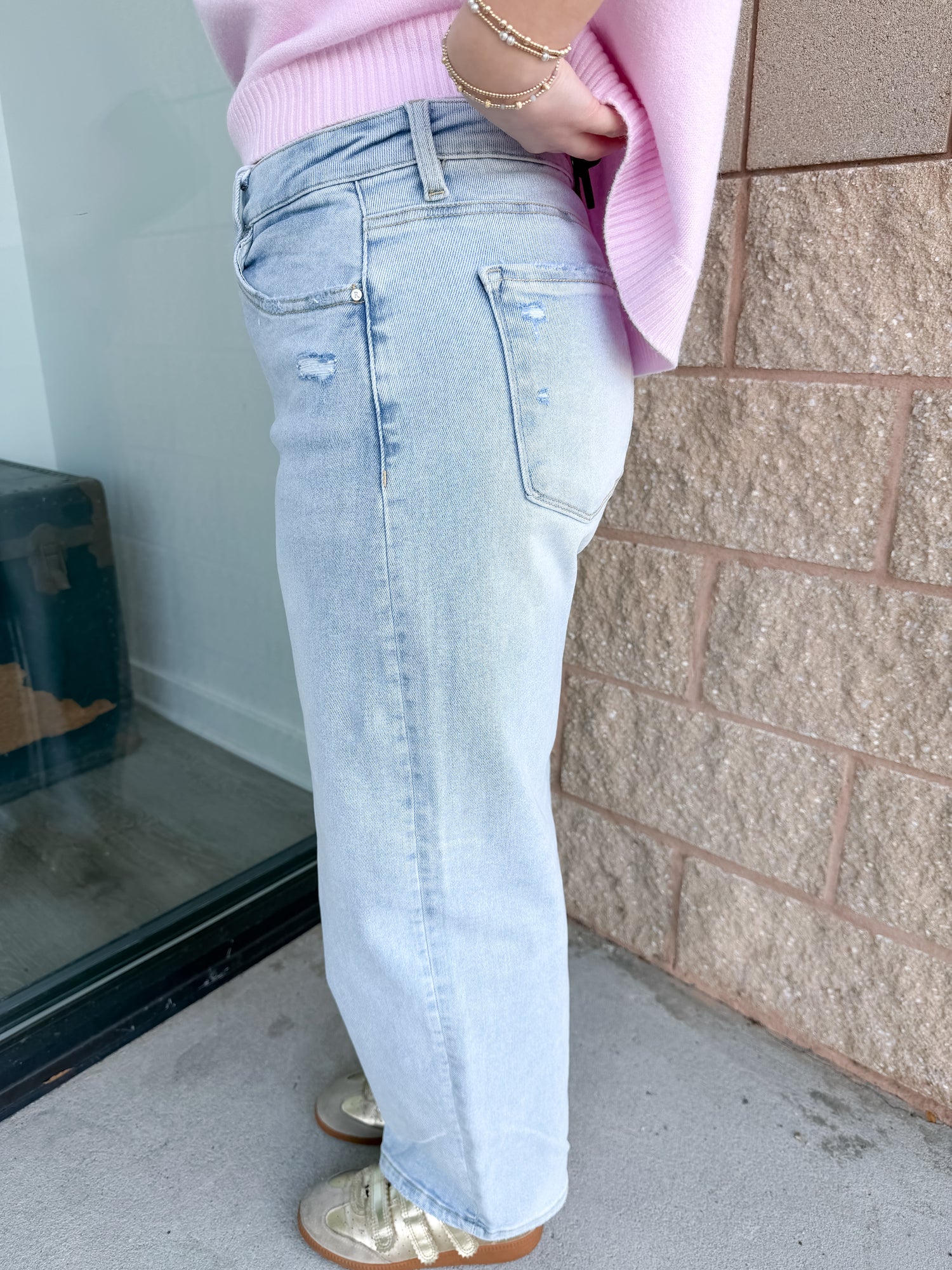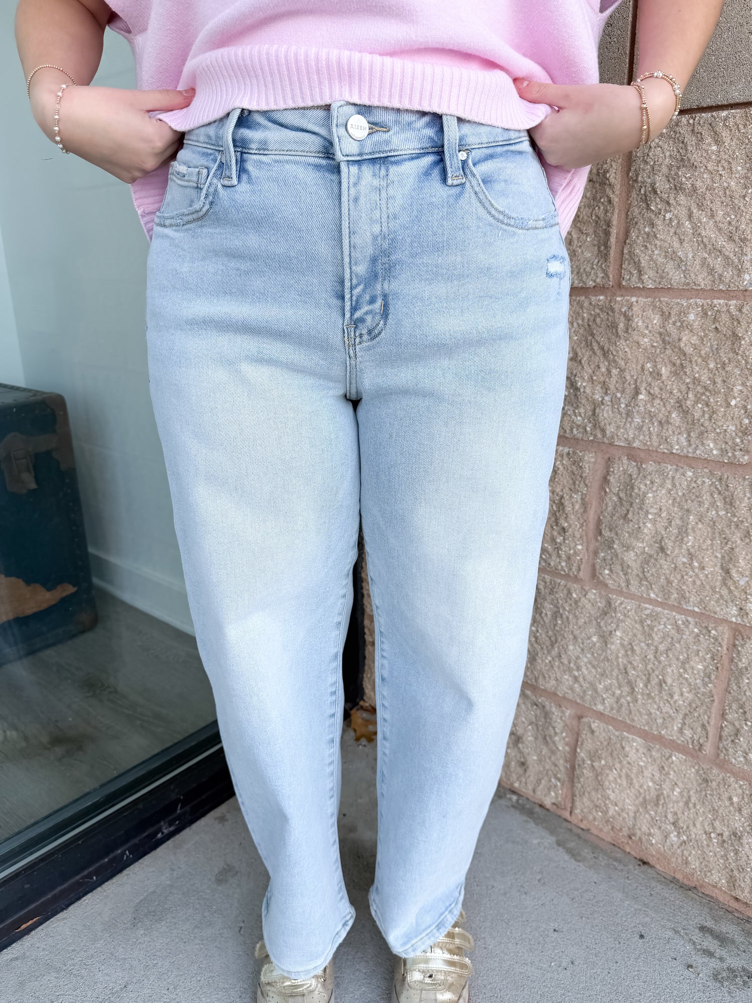 The Risen Kathy Jeans are light wash, high rise, cropped, and barrel style.