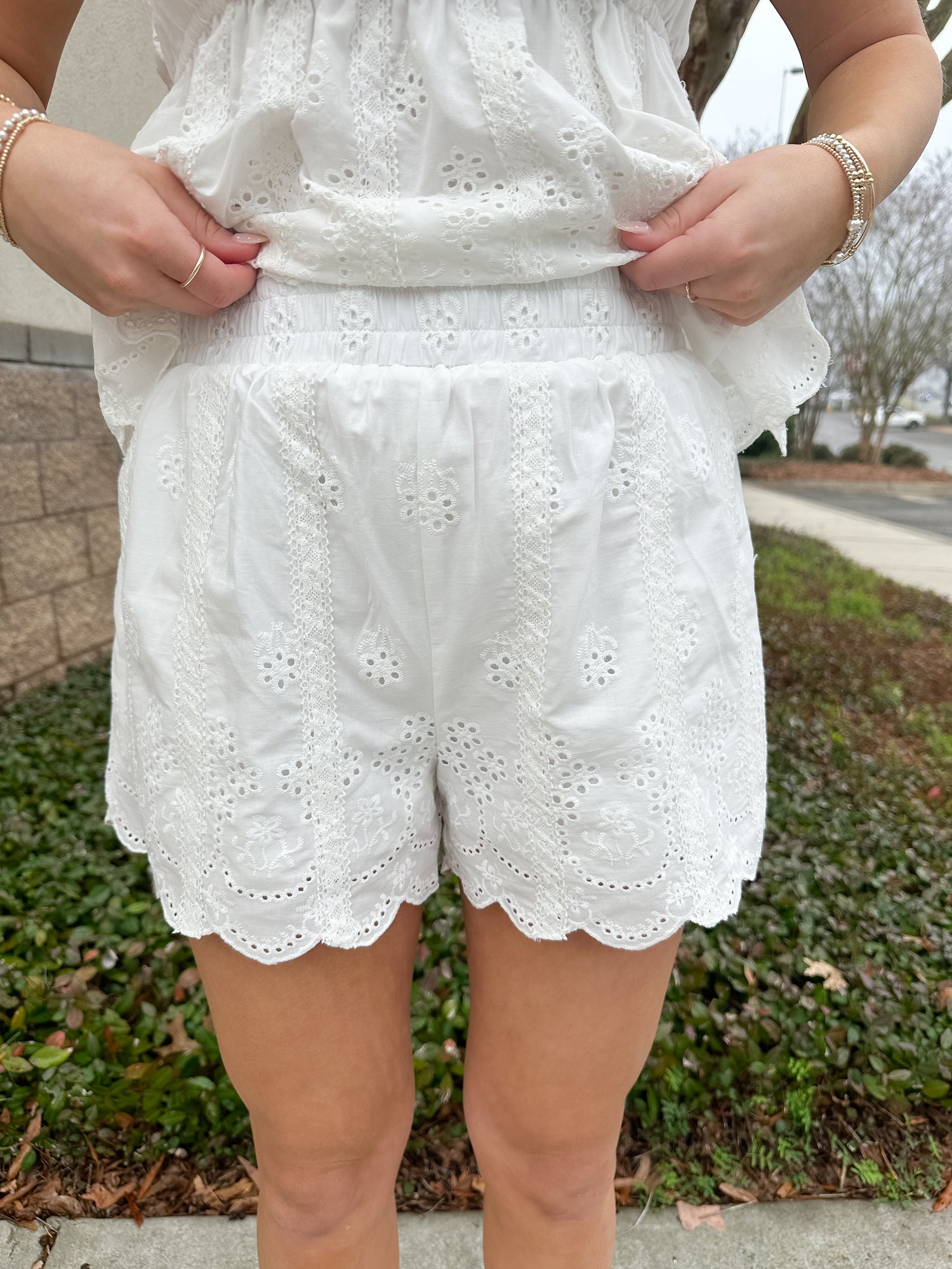 The San Jose Eyelet Set from Lelis is a lace trimmed smock high waisted pair of shorts with a smocked detail eyelet top.
