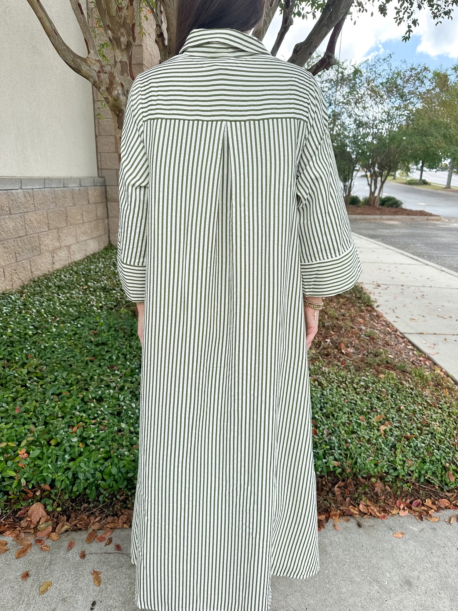 This Dress from Entro brings classic tailoring to a relaxed silhouette. Designed in 3 different color ways and cream vertical stripes that elongate the figure, it features a collared neckline, full-length button closure with a contrast trim, and cuffed three-quarter sleeves for a polished finish.