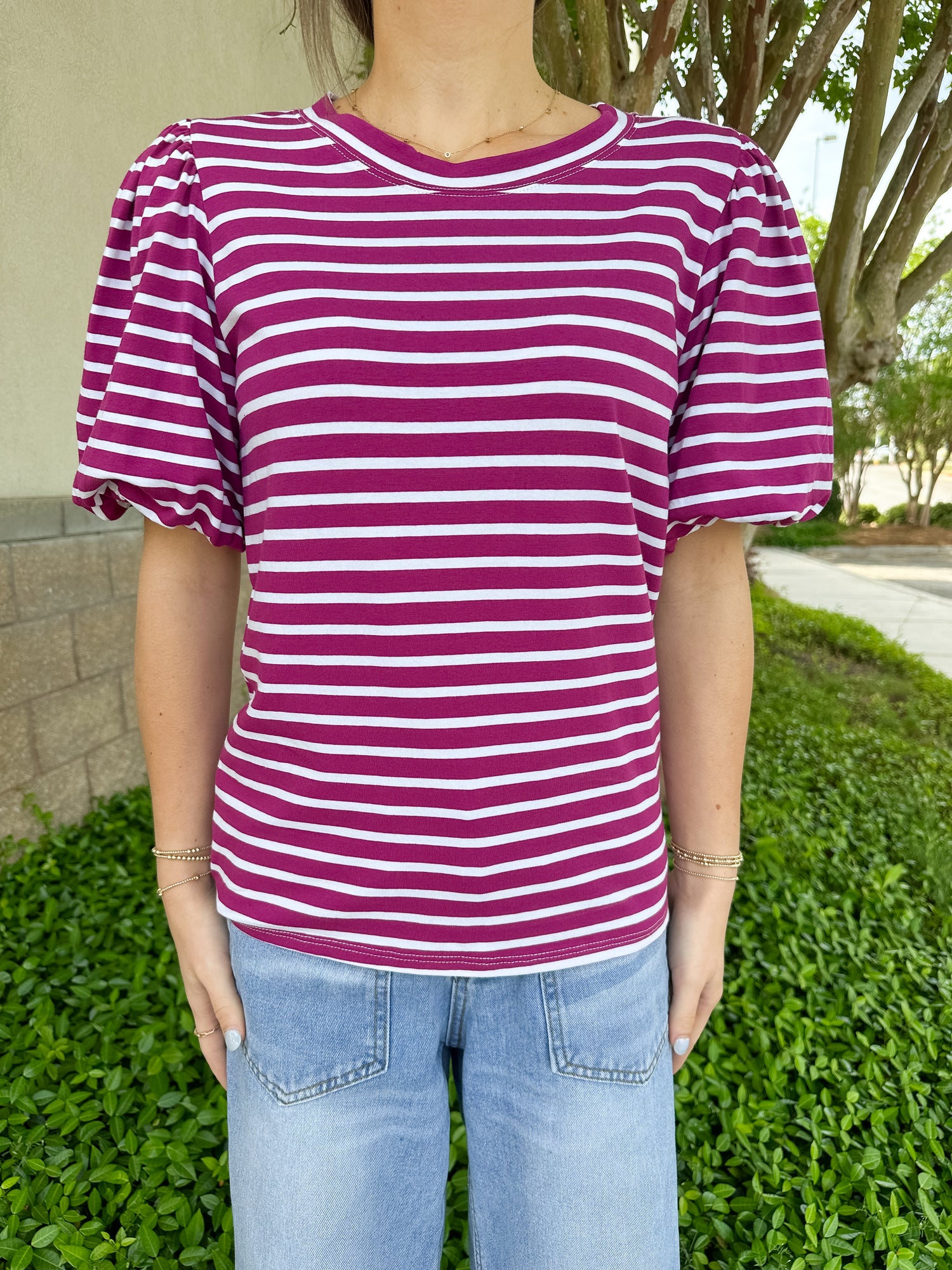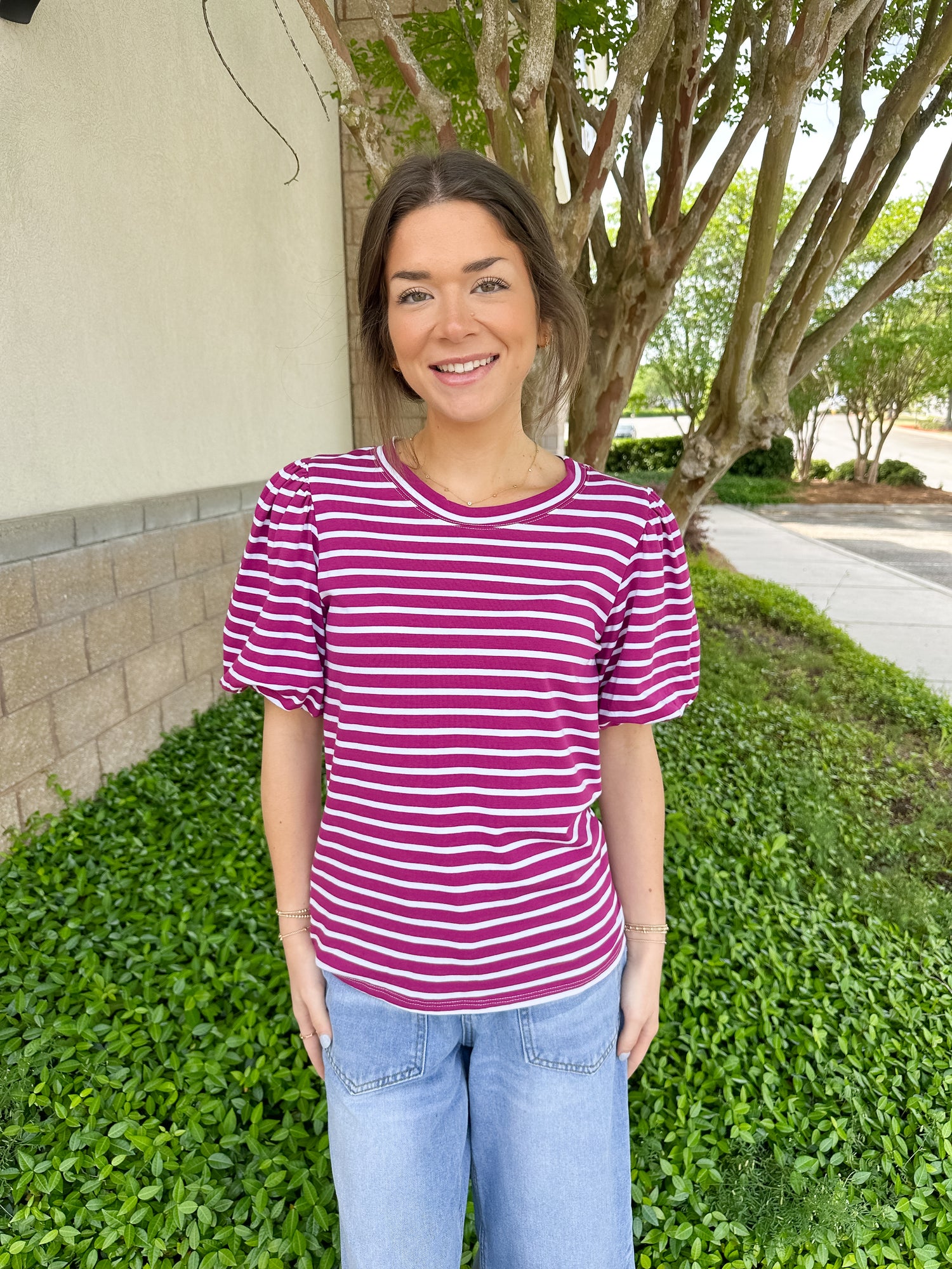 The Sawyer Top from Les Amis is stripe puff sleeve top made of 95% Cotton and 5% Spandex. Offered in magenta and Seafoam.