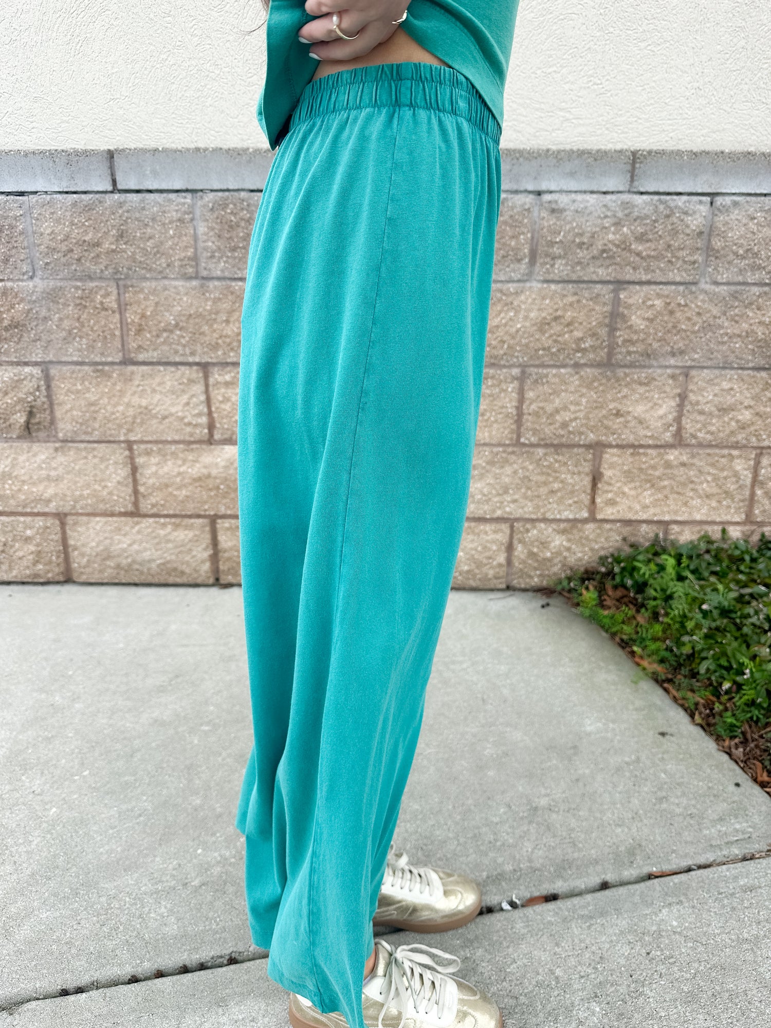 This pant is made with a 100% cotton jersey knit fabric and features a wide flare silhouette with an elastic waistband. This pant is a relaxed but stylish piece that looks so good with any of our everyday tops.