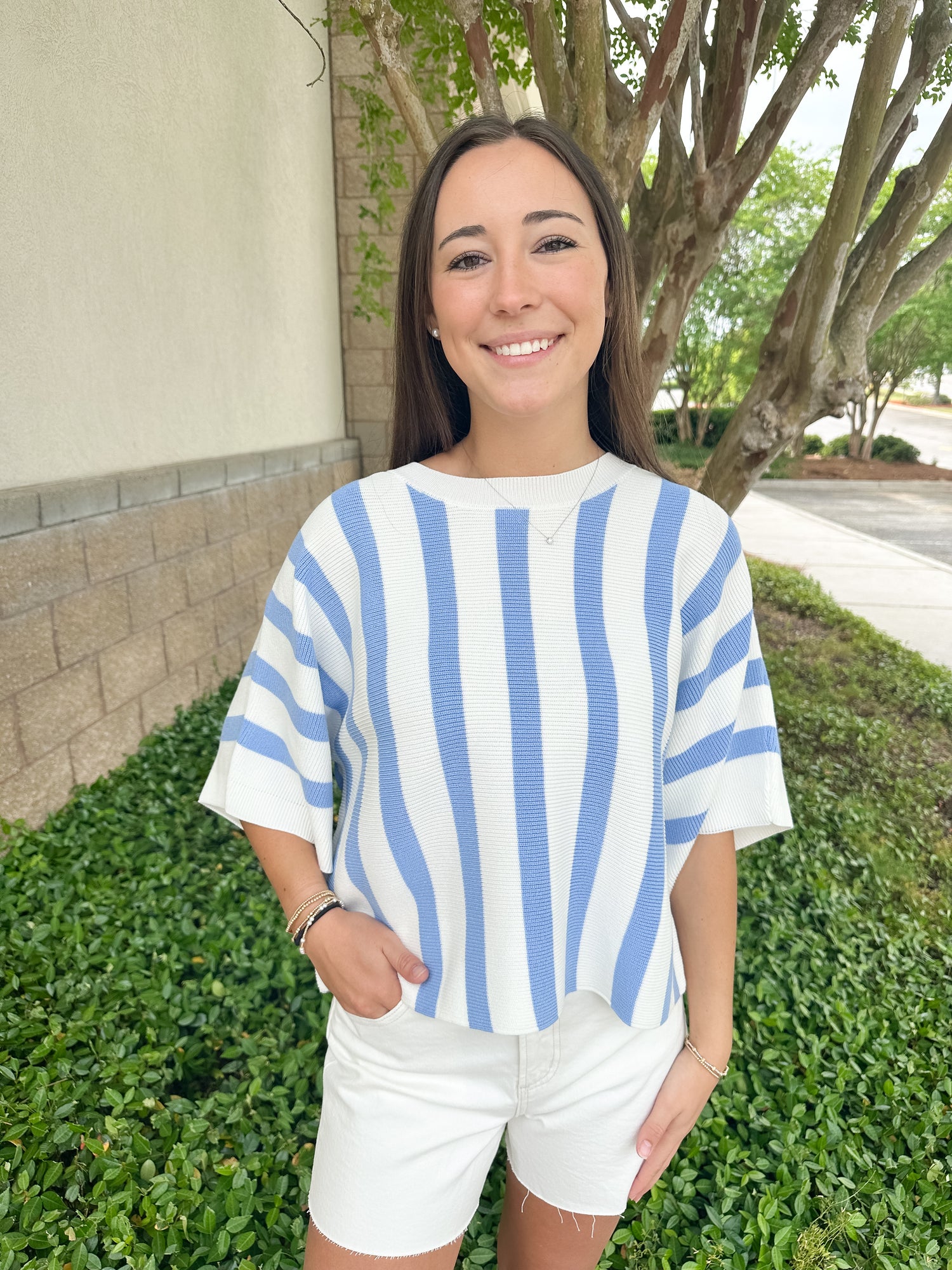 An easy, relaxed knit with bold vertical stripes and a breezy, boxy fit. Lightweight and effortless—perfect for everyday wear in fresh, sunny hues.