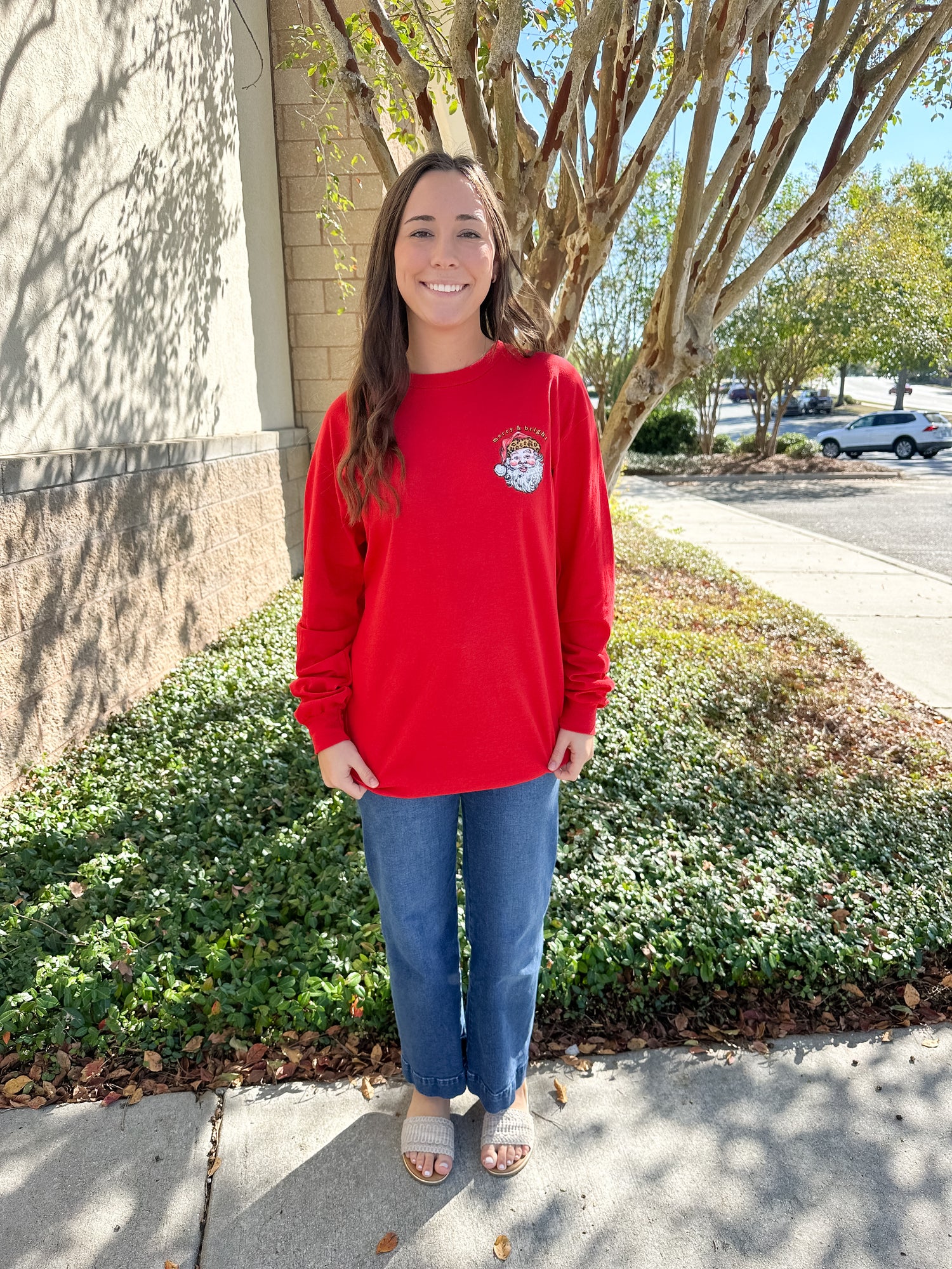 Red long sleeve shirt with the phrase 'merry and bright' in gold glitter and Santa wearing a leopard trimmed Santa hat. Simply Southern logo below. Similar design on left chest. The phrase 'merry and bright' along right sleeve. 100% cotton. Unisex sizing.