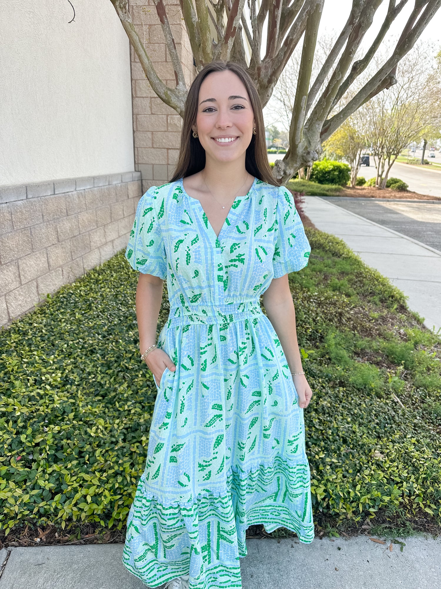 The Tracey Dress is an effortless favorite with feel-good details throughout. A split V-neckline and softly puffed sleeves add a touch of charm, while the smocked waist creates a flattering and comfortable fit. Finished with a tiered hem for easy movement and pockets for everyday practicality, this dress is made for days when you want to look put-together without trying too hard.