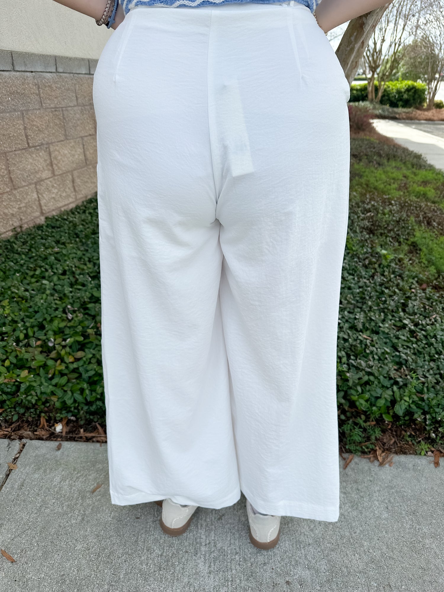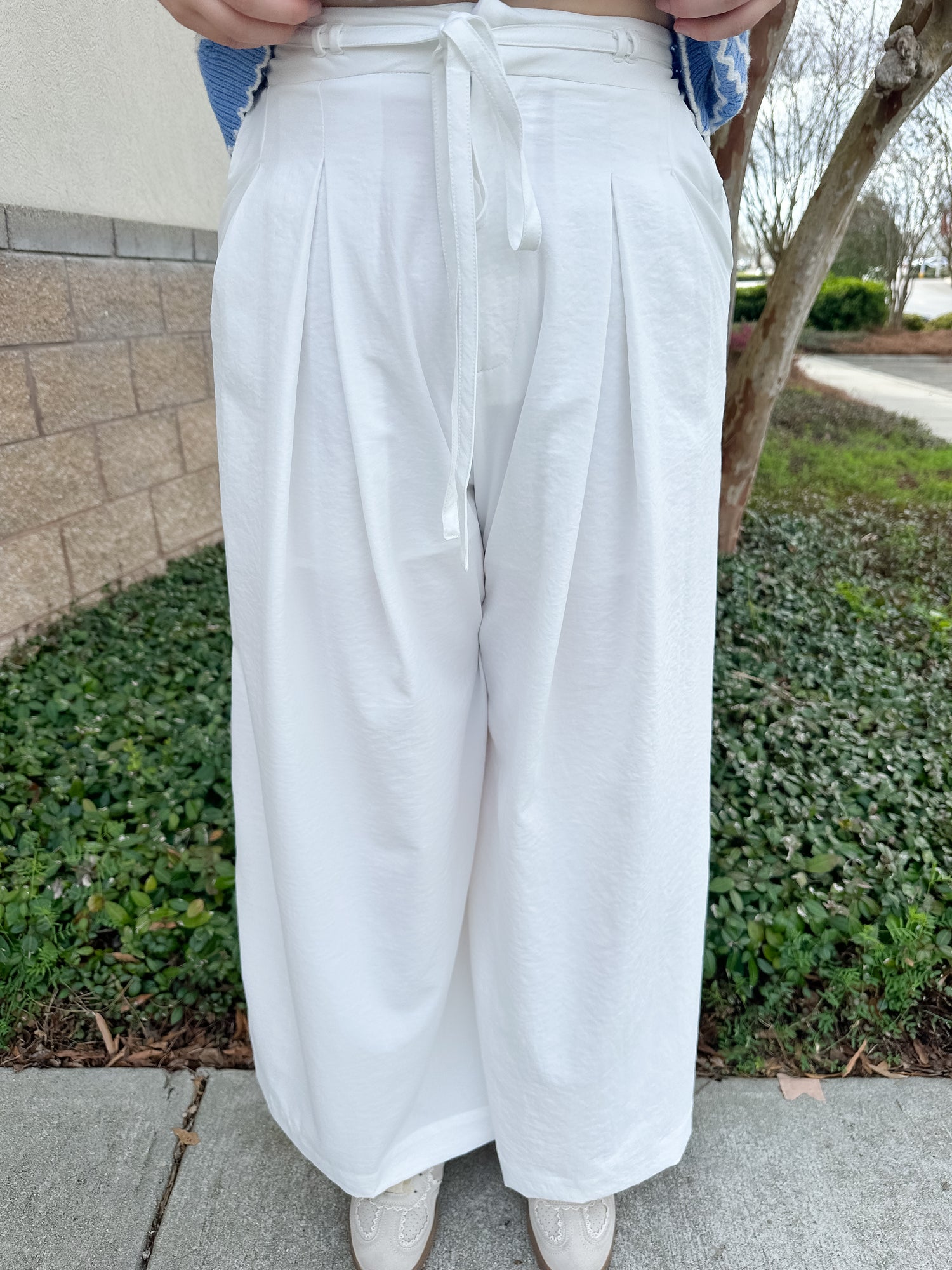 The Trinity Pleated Pants from Pinch are white pleated detail wide leg pants with a tie belt.