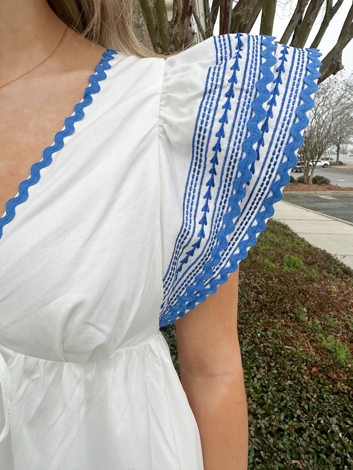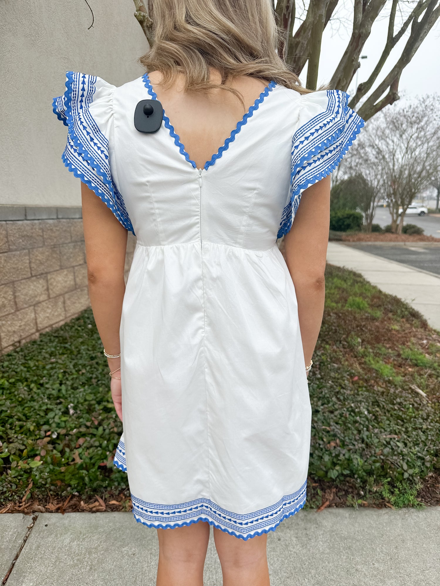 The Tulum Mini Dress from TCEC is a contrast embroidered flutter sleeve babydoll dress with a tie in the front.