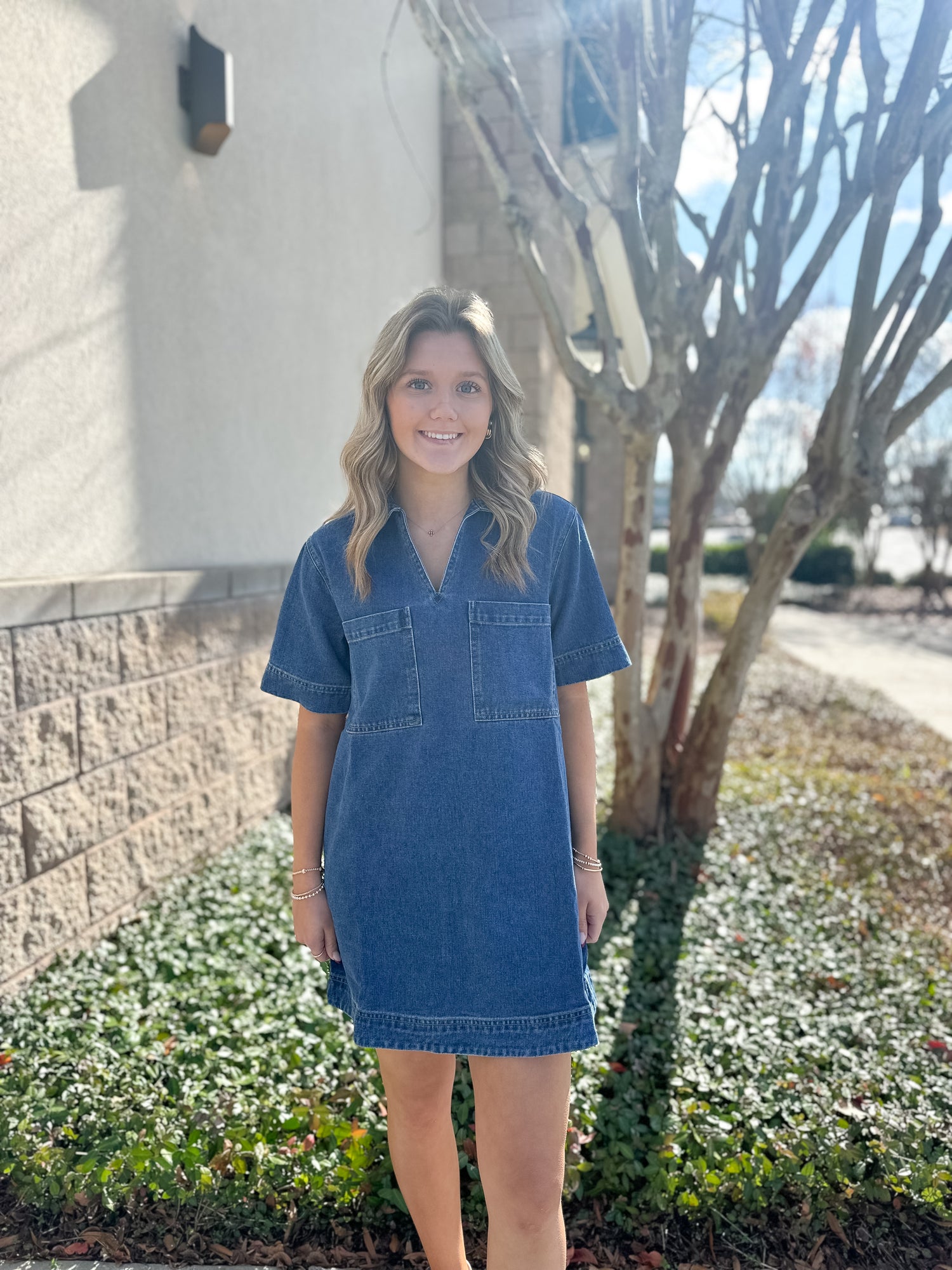 The Vayda Denim Dress is a dark wash v-neck denim mini dress from Lelis. Sizes XS-L available.